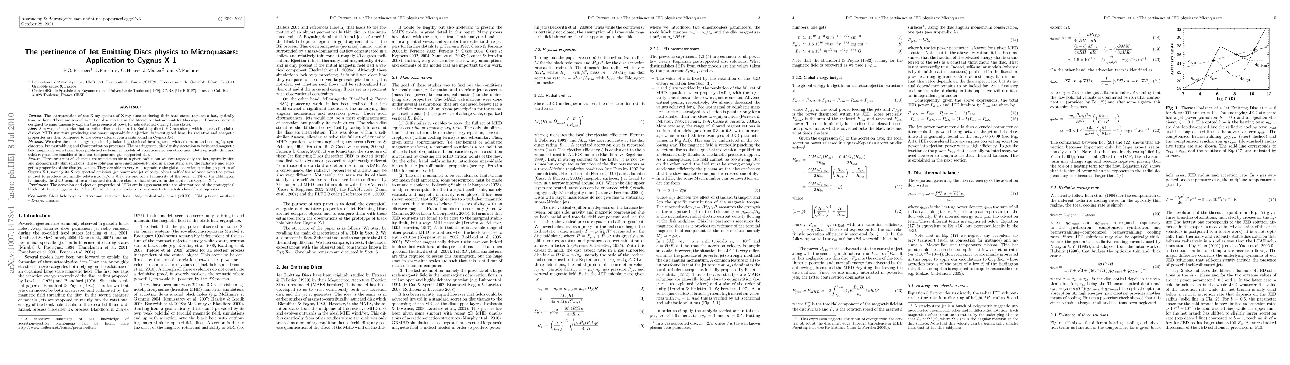 The interpretation of the X-ray spectra of X-ray binaries during their hard states requires a hot, optically thin medium. There are several accretion disc models in the literature that account for this aspect. However, none is designed to simultaneously explain the presence of powerful jets detected during these states. A new quasi-keplerian hot accretion disc solution, a Jet Emitting disc (JED hereafter), which is part of a global disc-jet MHD structure producing stationary super-alfv\'enic ejection, is investigated here. Its radiative and energetic properties are then compared to the observational constraints found in Cygnus X-1. We solve the disc energy equation by balancing the local heating term with advection and cooling by synchrotron, bremsstrahlung and Comptonization processes. The heating term, disc density, accretion velocity and magnetic field amplitude were taken from published self-similar models of accretion-ejection structures. Both optically thin and thick regimes are considered in a one temperature gas supported disc. Three branches of solutions are found possible at a given radius but we investigate only the hot, optically thin and geometrically slim solutions. These solutions give simultaneously, and in a consistent way, the radiative and energetics properties of the disc-jet system. They are able to very well reproduce the accretion-ejection properties of Cygnus X-1, namely its X-ray spectral emission, jet power and jet velocity. About half of the released accretion power is used to produce two mildly relativistic (v/c~0.5) jets and for a luminosity of the order of 1\% of the Eddington luminosity, the JED temperature and optical depth are close to that observed in the hard state Cygnus X-1. The JEDs properties are in agreement with the observations of the prototypical black hole binary Cygnus X-1. and are likely to be relevant to the whole class of microquasars.