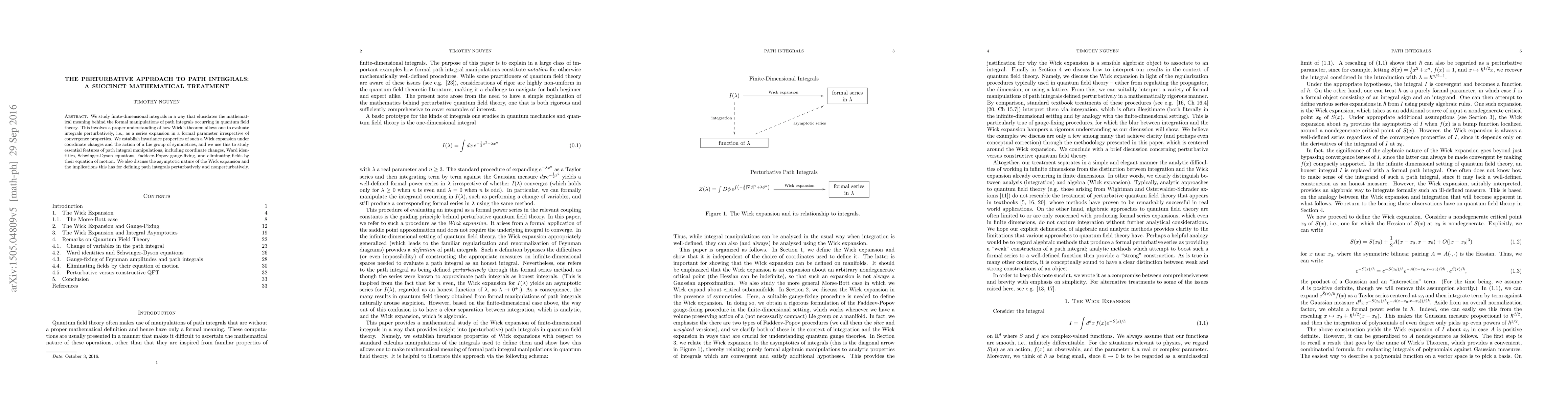 The paper introduces a succinct mathematical treatment of path integrals using Wick's theorem, providing a deeper understanding of their perturbative expansions and invariance properties.