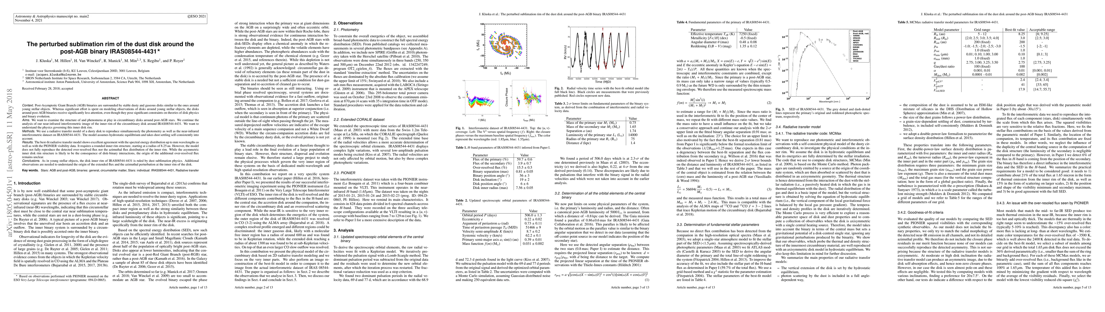 This paper investigates the perturbed sublimation rim of the dust disk around the post-AGB binary IRAS08544-4431 using a radiative transfer model. The model reveals a rounded inner rim starting at 8.25 au, but additional over-resolved flux and azimuthal perturbations remain unexplained, necessitating further observations.