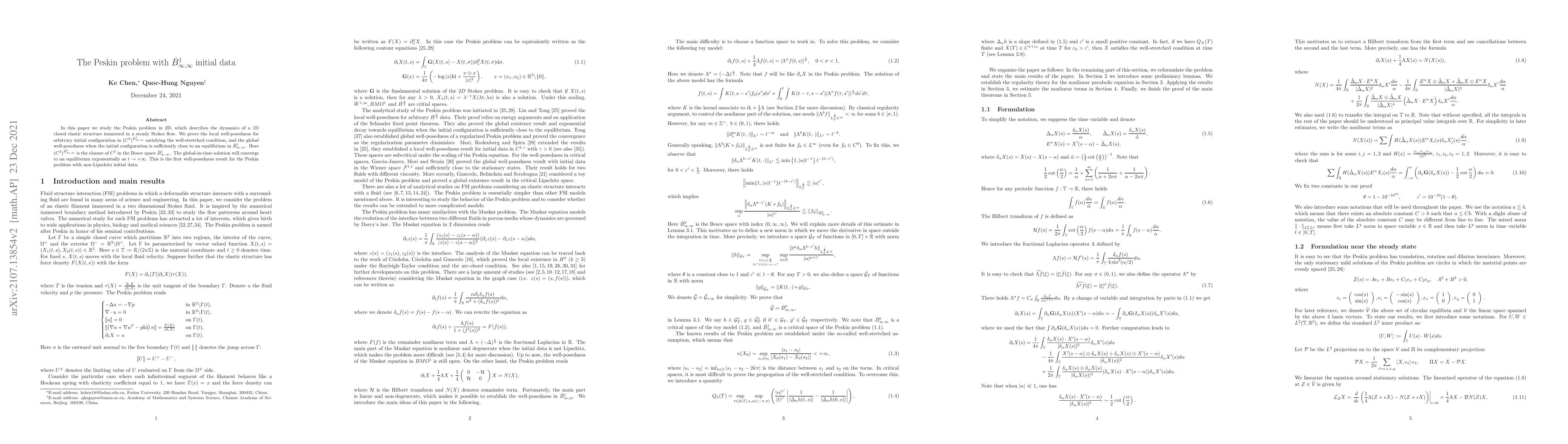 This paper proves local well-posedness for the 2D Peskin problem with initial data in $(C^2)^{\dot B^1_{\infty,\infty}}$ and global well-posedness for sufficiently close-to-equilibrium $\dot B^1_{\infty,\infty}$ data, with solutions converging to equilibrium exponentially over time. This marks the first well-posedness result for the Peskin problem with non-Lipschitz initial conditions.