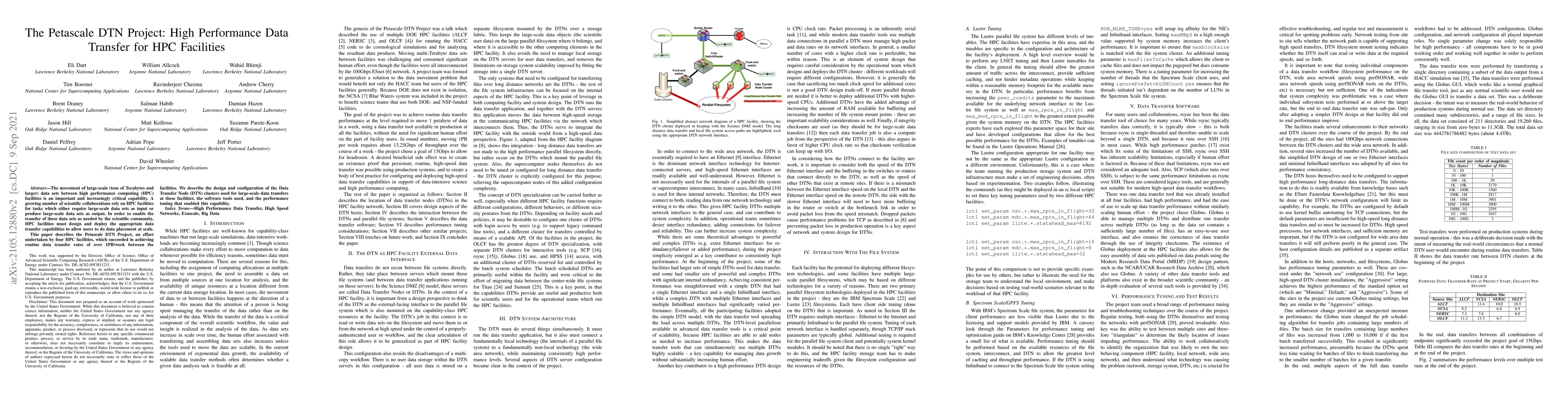 The Petascale DTN Project enabled high-performance data transfer rates of over 1PB/week between HPC facilities, utilizing specialized Data Transfer Node (DTN) clusters, software tools, and performance optimization techniques. This initiative addresses the critical need for large-scale data movement in scientific collaborations.