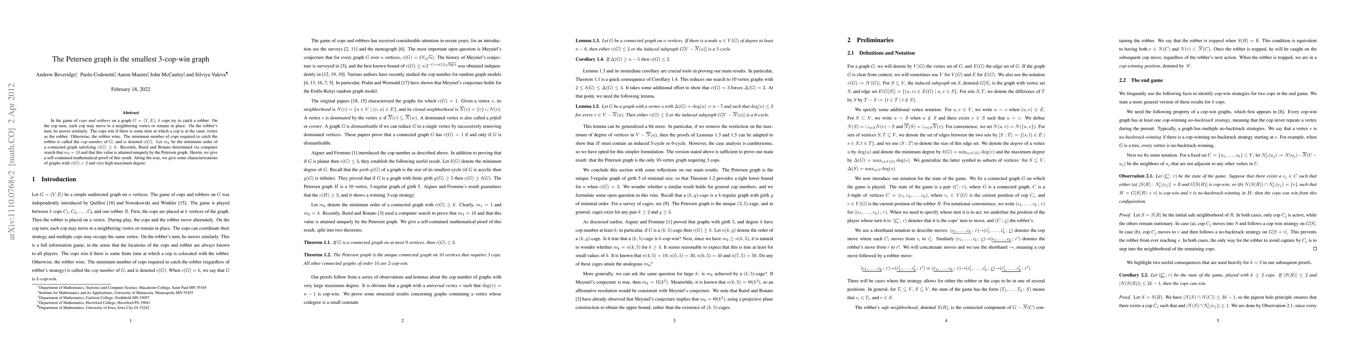 This paper provides a mathematical proof that the Petersen graph is the smallest graph requiring at least 3 cops to catch a robber, establishing it as the graph with the minimum order having a cop number of 3. Additionally, it explores characterizations of graphs with a cop number greater than 2 and high maximum degree.