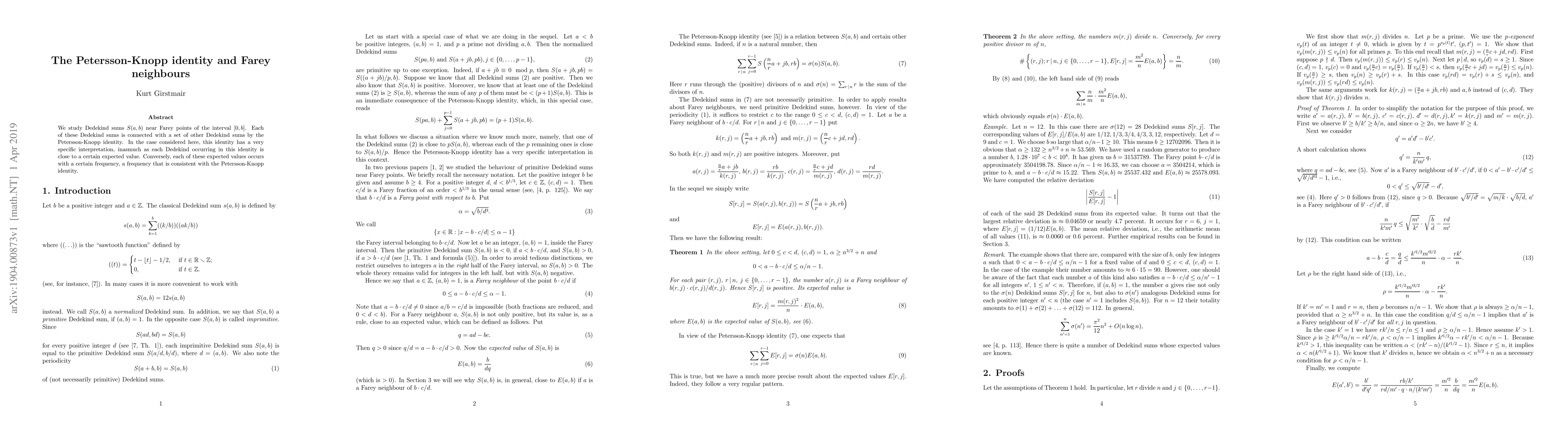We study Dedekind sums $S(a,b)$ near Farey points of the interval $[0,b]$. Each of these Dedekind sums is connected with a set of other Dedekind sums by the Petersson-Knopp identity. In the case considered here, this identity has a very specific interpretation, inasmuch as each Dedekind occurring in this identity is close to a certain expected value. Conversely, each of these expected values occurs with a certain frequency, a frequency that is consistent with the Petersson-Knopp identity.