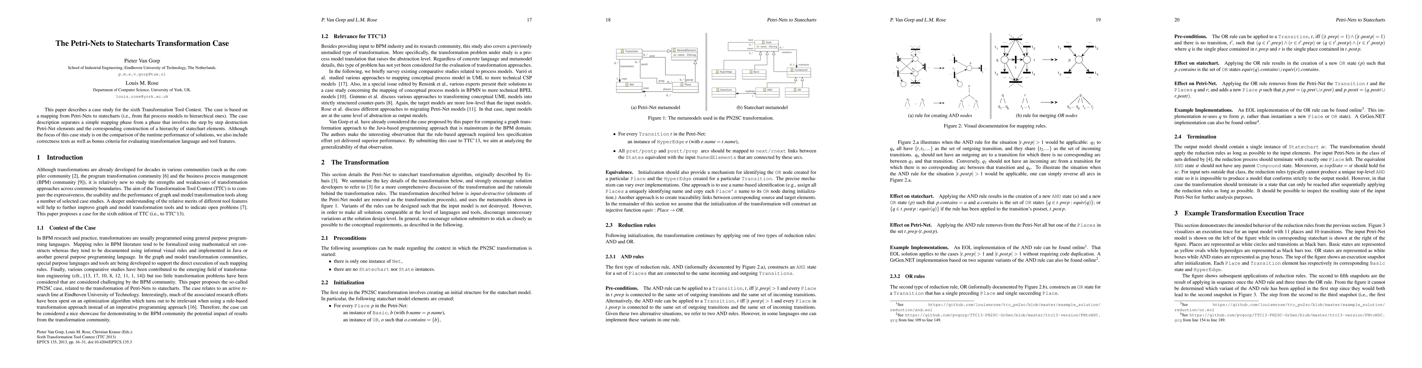 This paper presents a case study for the Transformation Tool Contest focusing on the translation from Petri-Nets to statecharts, analyzing both runtime performance and correctness, while also evaluating transformation language and tool features.
