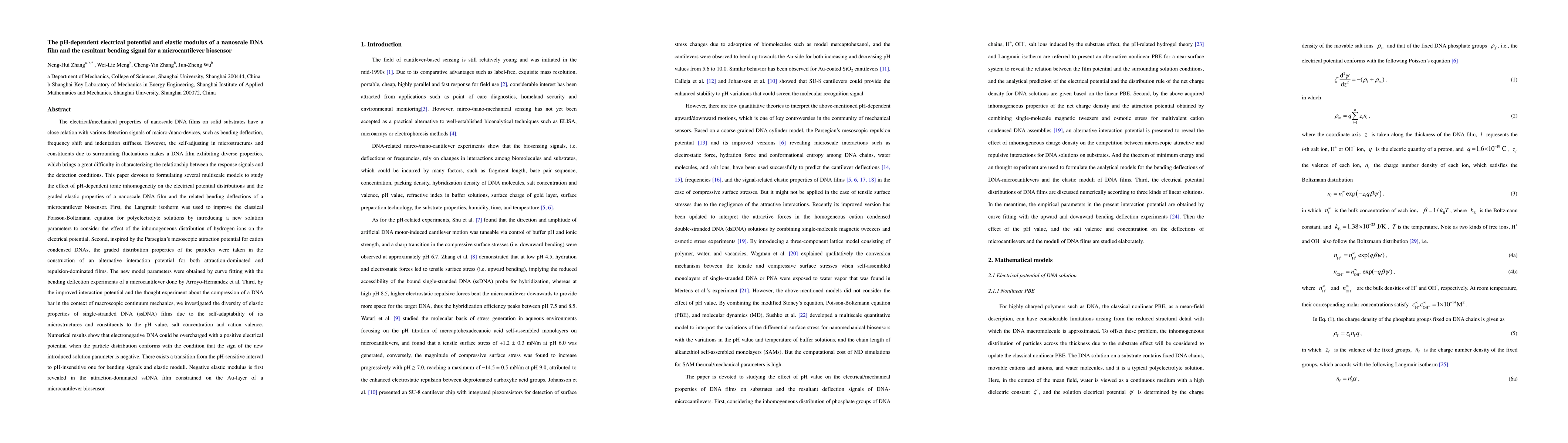 This paper devotes to formulating several multiscale models to study the effect of pH-dependent ionic inhomogeneity on the electrical potential distributions and the graded elastic properties of a nanoscale DNA film and the related bending deflections of a microcantilever biosensor. First, the Langmuir isotherm was used to improve the classical Poisson-Boltzmann equation for polyelectrolyte solutions by introducing a new solution parameters to consider the effect of the inhomogeneous distribution of hydrogen ions on the electrical potential. Second, inspired by the Parsegian's mesoscopic attraction potential for cation condensed DNAs, the graded distribution properties of the particles were taken in the construction of an alternative interaction potential for both attraction-dominated and repulsion-dominated films. The new model parameters were obtained by curve fitting with the bending deflection experiments of a microcantilever done by Arroyo-Hernandez et al. Third, by the improved interaction potential and the thought experiment about the compression of a DNA bar in the context of macroscopic continuum mechanics, we investigated the diversity of elastic properties of single-stranded DNA (ssDNA) films due to the self-adaptability of its microstructures and constituents to the pH value, salt concentration and cation valence. Numerical results show that electronegative DNA could be overcharged with a positive electrical potential when the particle distribution conforms with the condition that the sign of the new introduced solution parameter is negative. There exists a transition from the pH-sensitive interval to pH-insensitive one for bending signals and elastic moduli. Negative elastic modulus is first revealed in the attraction-dominated ssDNA film constrained on the Au-layer of a microcantilever biosensor.