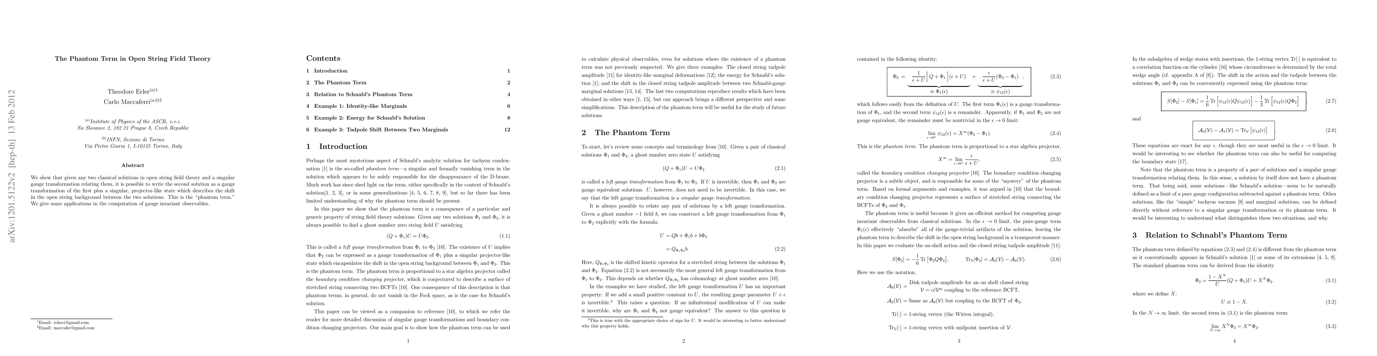 We show that given any two classical solutions in open string field theory and a singular gauge transformation relating them, it is possible to write the second solution as a gauge transformation of the first plus a singular, projector-like state which describes the shift in the open string background between the two solutions. This is the "phantom term." We give some applications in the computation of gauge invariant observables.