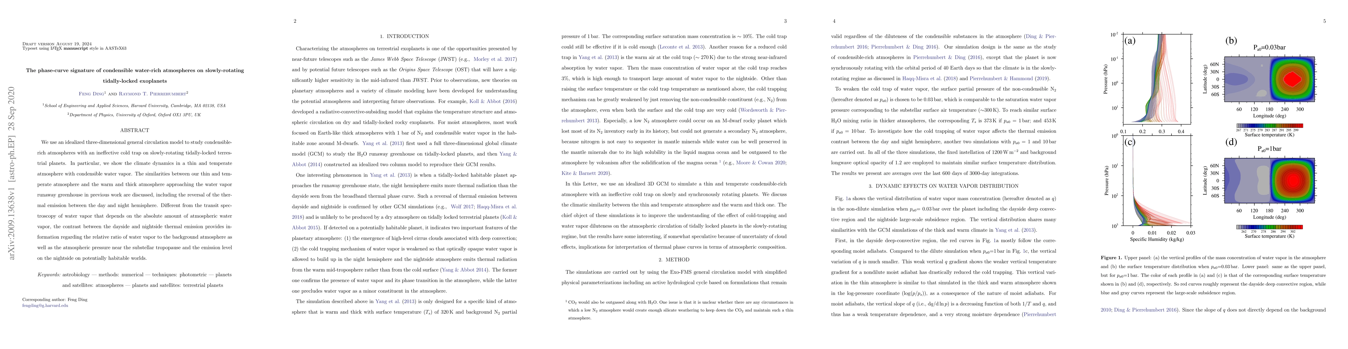 This paper investigates the climate dynamics of condensible water-rich atmospheres on slowly rotating tidally locked exoplanets using a three-dimensional general circulation model. It highlights the phase-curve signature differences between thin temperate atmospheres and warm, thick atmospheres, focusing on the relative water vapor ratio and atmospheric pressure near the substellar tropopause.