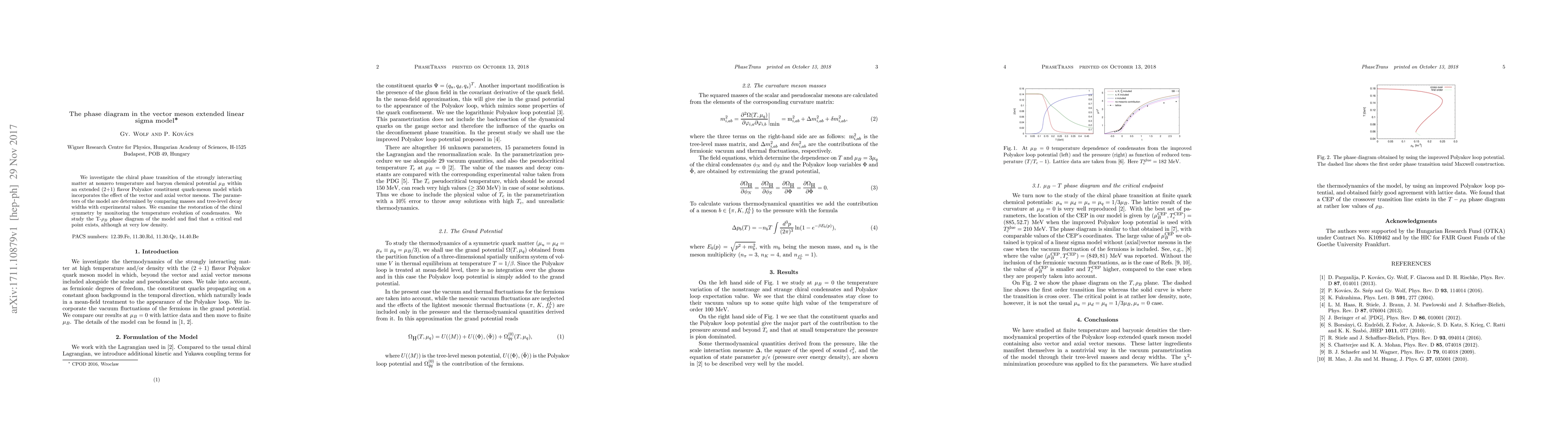 We investigate the chiral phase transition of the strongly interacting matter at nonzero temperature and baryon chemical potential $\mu_B$ within an extended (2+1) flavor Polyakov constituent quark-meson model which incorporates the effect of the vector and axial vector mesons. The parameters of the model are determined by comparing masses and tree-level decay widths with experimental values. We examine the restoration of the chiral symmetry by monitoring the temperature evolution of condensates. We study the $T-\rho_B$ phase diagram of the model and find that a critical end point exists, although at very low density.