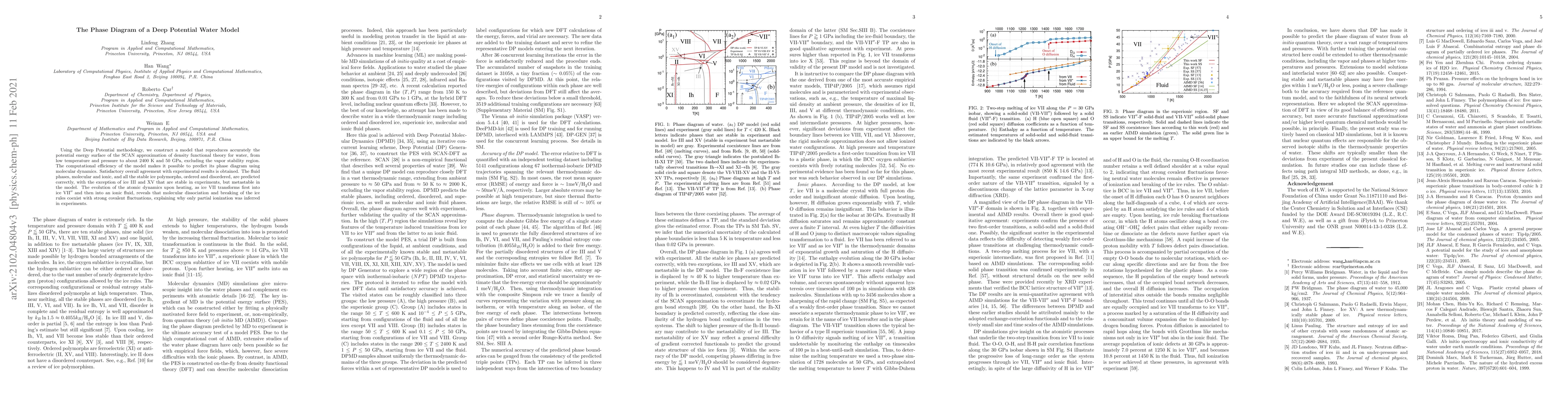 Using the Deep Potential methodology, we construct a model that reproduces accurately the potential energy surface of the SCAN approximation of density functional theory for water, from low temperature and pressure to about 2400 K and 50 GPa, excluding the vapor stability region. The computational efficiency of the model makes it possible to predict its phase diagram using molecular dynamics. Satisfactory overall agreement with experimental results is obtained. The fluid phases, molecular and ionic, and all the stable ice polymorphs, ordered and disordered, are predicted correctly, with the exception of ice III and XV that are stable in experiments, but metastable in the model. The evolution of the atomic dynamics upon heating, as ice VII transforms first into ice VII$''$ and then into an ionic fluid, reveals that molecular dissociation and breaking of the ice rules coexist with strong covalent fluctuations, explaining why only partial ionization was inferred in experiments.