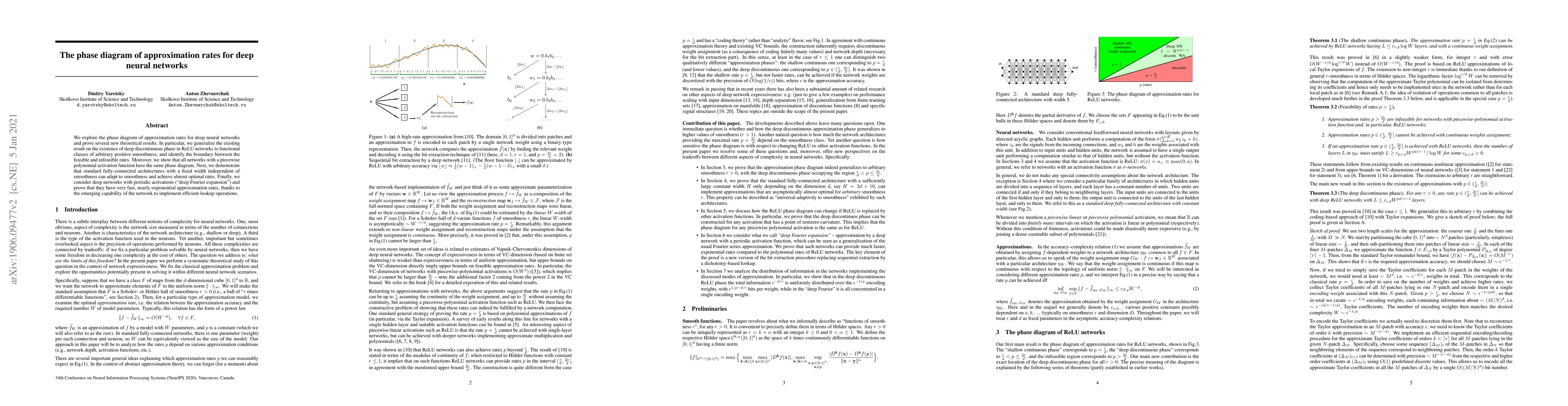 We explore the phase diagram of approximation rates for deep neural networks and prove several new theoretical results. In particular, we generalize the existing result on the existence of deep discontinuous phase in ReLU networks to functional classes of arbitrary positive smoothness, and identify the boundary between the feasible and infeasible rates. Moreover, we show that all networks with a piecewise polynomial activation function have the same phase diagram. Next, we demonstrate that standard fully-connected architectures with a fixed width independent of smoothness can adapt to smoothness and achieve almost optimal rates. Finally, we consider deep networks with periodic activations ("deep Fourier expansion") and prove that they have very fast, nearly exponential approximation rates, thanks to the emerging capability of the network to implement efficient lookup operations.