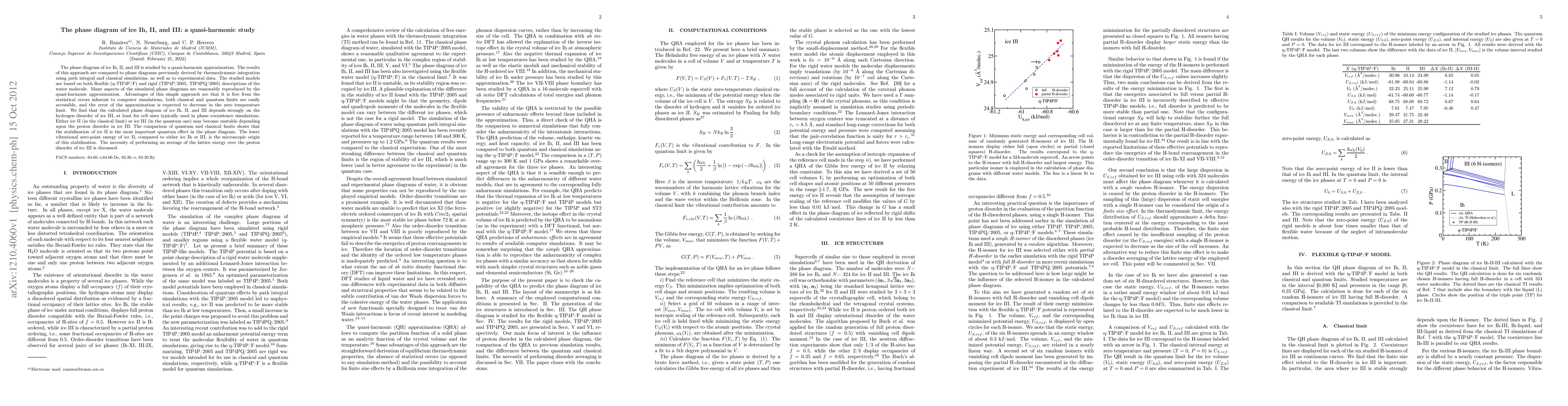 This study uses a quasi-harmonic approximation to investigate the phase diagram of ice Ih, II, and III, comparing results to previous simulations and experimental data. The approach effectively reproduces many aspects of the phase diagram, highlighting the stabilization of ice II due to its lower vibrational zero-point energy, with significant implications for the proton disorder in ice III.
