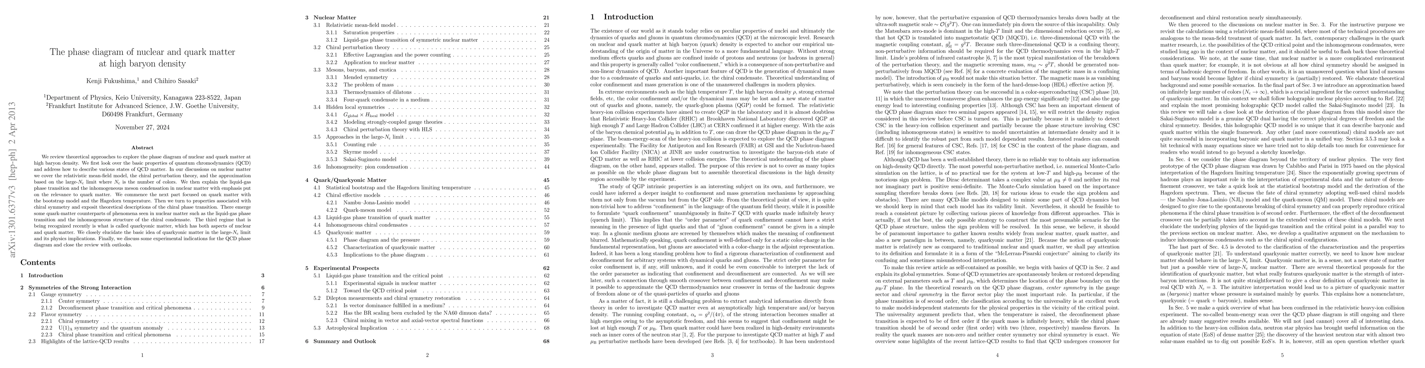 We review theoretical approaches to explore the phase diagram of nuclear and quark matter at high baryon density. We first look over the basic properties of quantum chromodynamics (QCD) and address how to describe various states of QCD matter. In our discussions on nuclear matter we cover the relativistic mean-field model, the chiral perturbation theory, and the approximation based on the large-Nc limit where Nc is the number of colors. We then explain the liquid-gas phase transition and the inhomogeneous meson condensation in nuclear matter with emphasis put on the relevance to quark matter. We commence the next part focused on quark matter with the bootstrap model and the Hagedorn temperature. Then we turn to properties associated with chiral symmetry and exposit theoretical descriptions of the chiral phase transition. There emerge some quark-matter counterparts of phenomena seen in nuclear matter such as the liquid-gas phase transition and the inhomogeneous structure of the chiral condensate. The third regime that is being recognized recently is what is called quarkyonic matter, which has both aspects of nuclear and quark matter. We closely elucidate the basic idea of quarkyonic matter in the large-Nc limit and its physics implications. Finally, we discuss some experimental indications for the QCD phase diagram and close the review with outlooks.