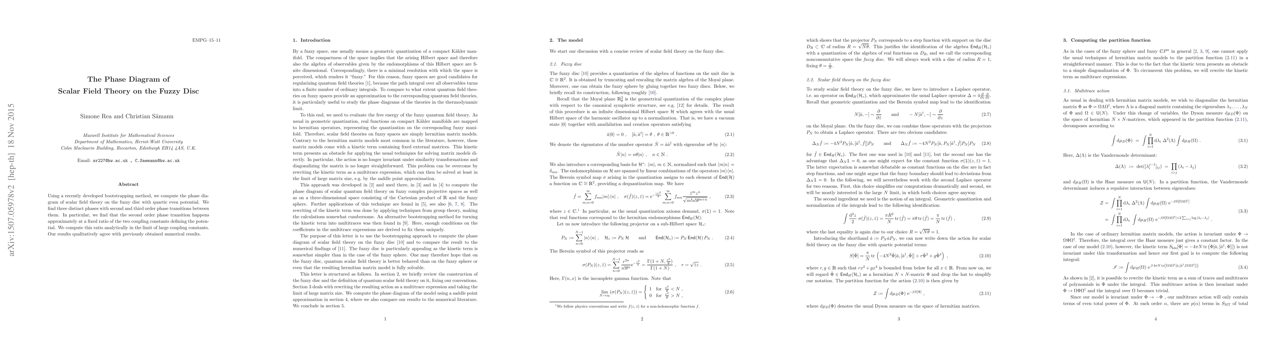 Researchers calculated the phase diagram of scalar field theory on a fuzzy disc with a specific potential, finding three distinct phases with second and third order transitions, and a fixed ratio between coupling constants that correlates to previously obtained numerical results.