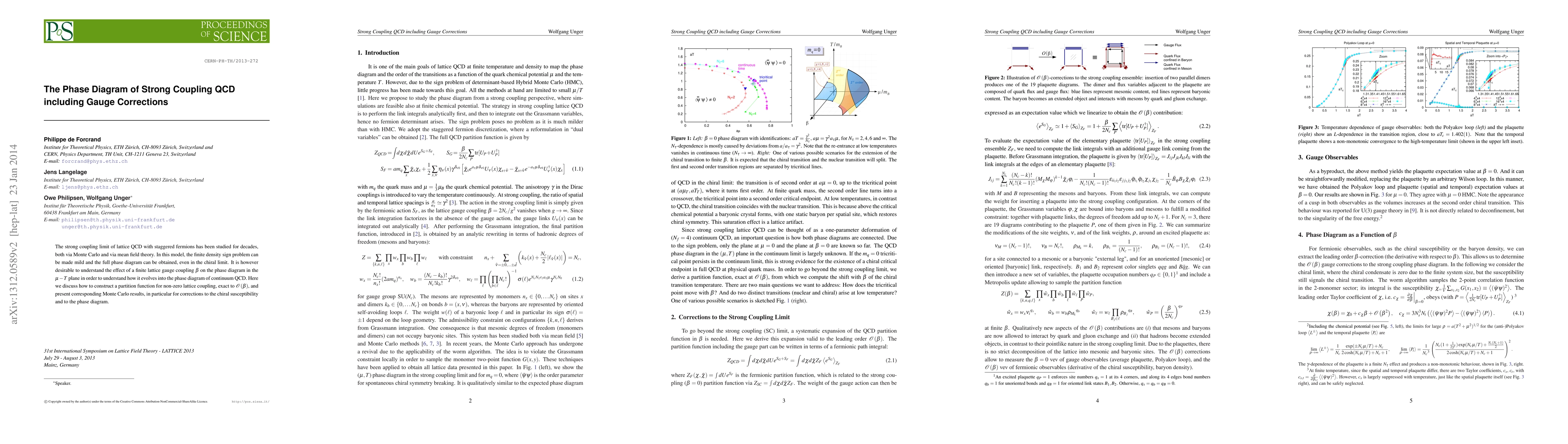 This paper investigates the phase diagram of strong coupling QCD with staggered fermions, focusing on the effects of finite lattice gauge coupling $\beta$. It constructs an exact partition function to $\mathcal{O}(\beta)$ and presents Monte Carlo results, highlighting corrections to the chiral susceptibility and the phase diagram evolution towards continuum QCD.