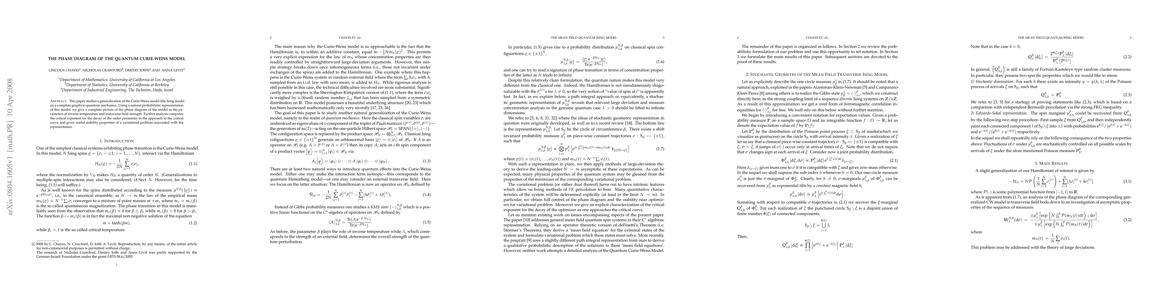 This paper studies a generalization of the Curie-Weiss model (the Ising model on a complete graph) to quantum mechanics. Using a natural probabilistic representation of this model, we give a complete picture of the phase diagram of the model in the parameters of inverse temperature and transverse field strength. Further analysis computes the critical exponent for the decay of the order parameter in the approach to the critical curve and gives useful stability properties of a variational problem associated with the representation.
