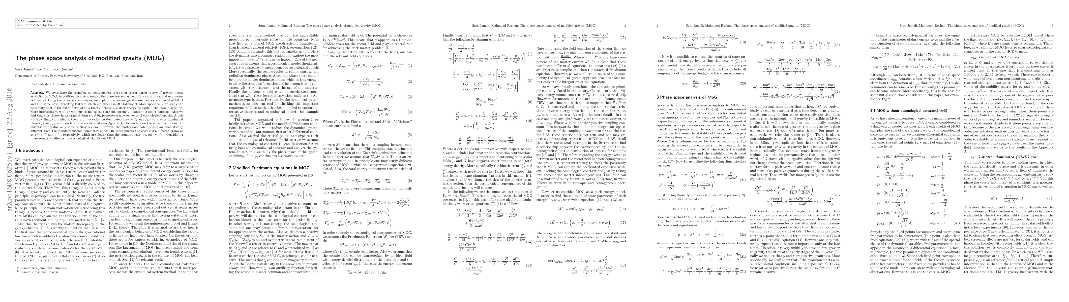 We investigate the cosmological consequences of a scalar-vector-tensor theory of gravity known as MOG. In MOG, in addition to metric tensor, there are two scalar fields $G(x)$ and $\mu(x)$, and one vector field $\phi_{\alpha}(x)$. Using the phase space analysis, we explore the cosmological consequences of a model of MOG and find some new interesting features which are absent in $\Lambda$CDM model. More specifically we study the possibility that if the extra fields of this theory behave like dark energy to explain the cosmic speedup. More interestingly, with or without cosmological constant, strongly phantom crossing happens. Also we find that this theory in its original form ($\Lambda\neq 0$), possesses a true sequence of cosmological epochs. Albeit we show that, surprisingly, there are two radiation dominated epochs $f_5$ and $f_6$, two matter dominated phases $f_3$ and $f_4$, and two late time accelerated eras $f_{12}$ and $f_{7}$. Depending on the initial conditions the universe will realize only three of these six eras. However, the matter dominated phases are dramatically different from the standard matter dominated epoch. In these phases the cosmic scale factor grows as $a(t)\sim t^{0.46}$ and $t^{0.52}$, respectively, which are slower than the standard case, i.e. $a(t)\sim t^{2/3}$. Considering these results we discuss the cosmological viability of MOG.