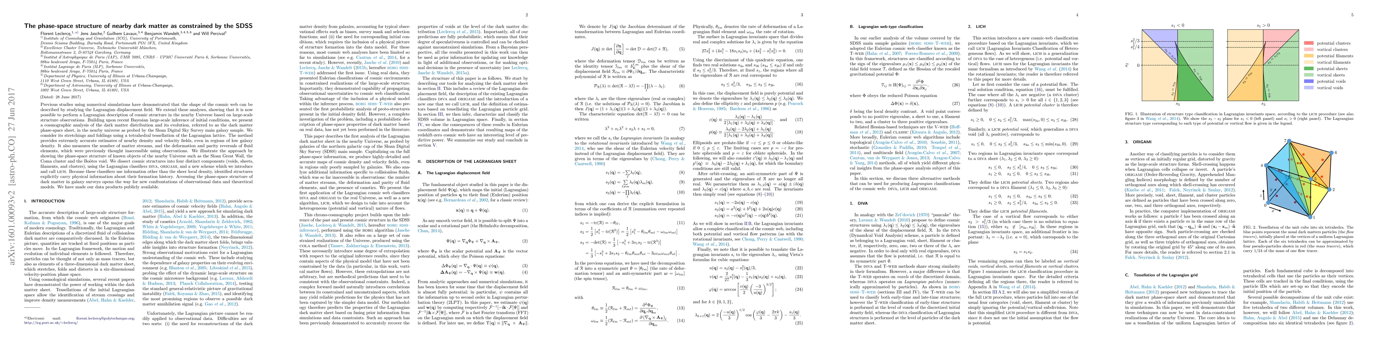 This paper presents a method to analyze the phase-space structure of nearby dark matter using the Sloan Digital Sky Survey (SDSS) data, revealing the cosmic web's evolution through a Lagrangian description. The study introduces new cosmographic classifiers to dissect cosmic structures into voids, sheets, filaments, and clusters, providing insights into their formation history.