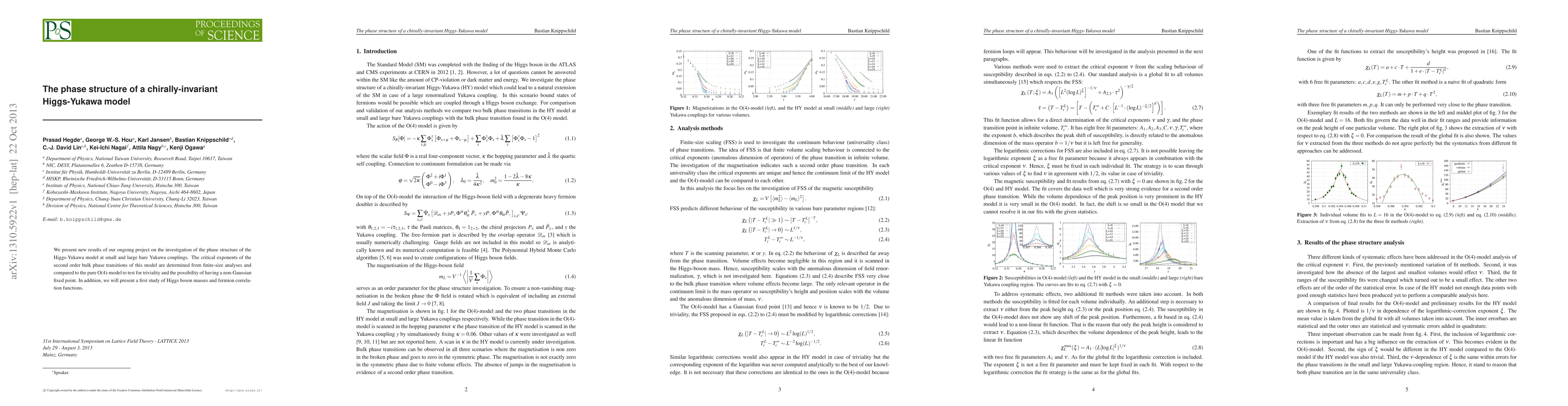 This paper investigates the phase structure of the chirally-invariant Higgs-Yukawa model, determining critical exponents for second-order phase transitions and comparing them to the pure O(4)-model to explore triviality and non-Gaussian fixed points. It also initiates a study of Higgs boson masses and fermion correlation functions.