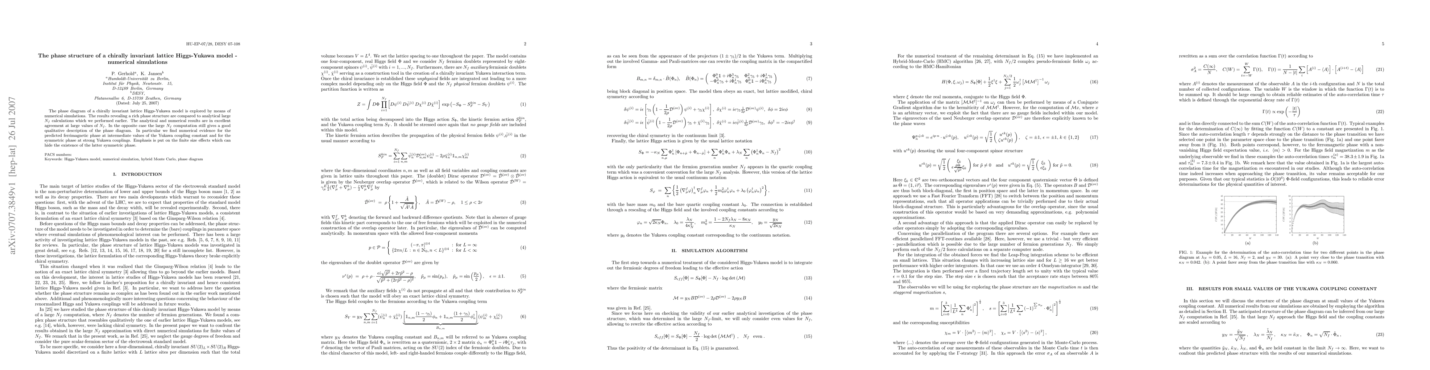 This paper investigates the phase structure of a chirally invariant lattice Higgs-Yukawa model through numerical simulations, revealing a rich phase diagram. The results align well with earlier analytical large Nf calculations, confirming the existence of a ferrimagnetic phase and a symmetric phase at strong Yukawa couplings, while noting finite size effects that may obscure the latter.