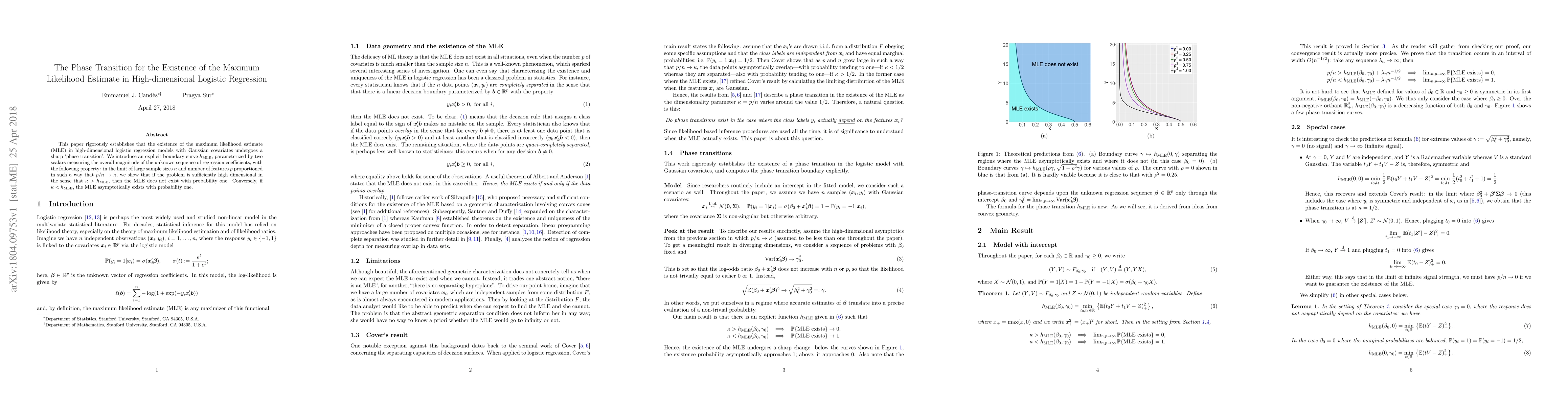 This paper demonstrates a phase transition for the existence of the maximum likelihood estimate in high-dimensional logistic regression, showing that the MLE exists with high probability if the number of features is below a critical threshold relative to the sample size. Conversely, the MLE does not exist with high probability when the feature-to-sample ratio exceeds this threshold.