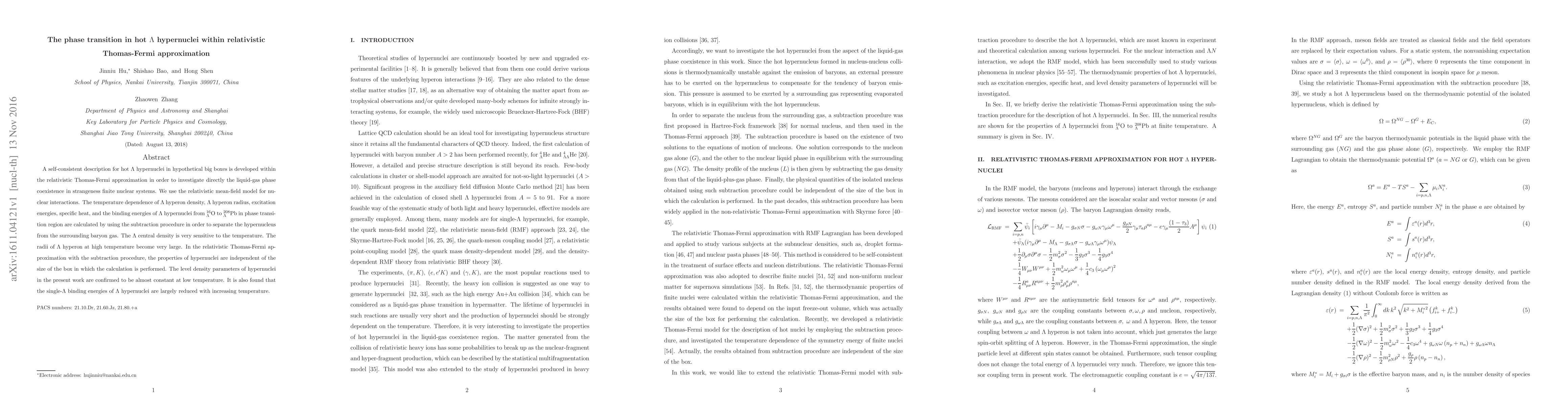 This paper develops a relativistic Thomas-Fermi approximation to study the liquid-gas phase transition in hot $\Lambda$ hypernuclei, finding that $\Lambda$ hyperon density and radius are highly temperature-dependent, and that binding energies are significantly reduced at higher temperatures.