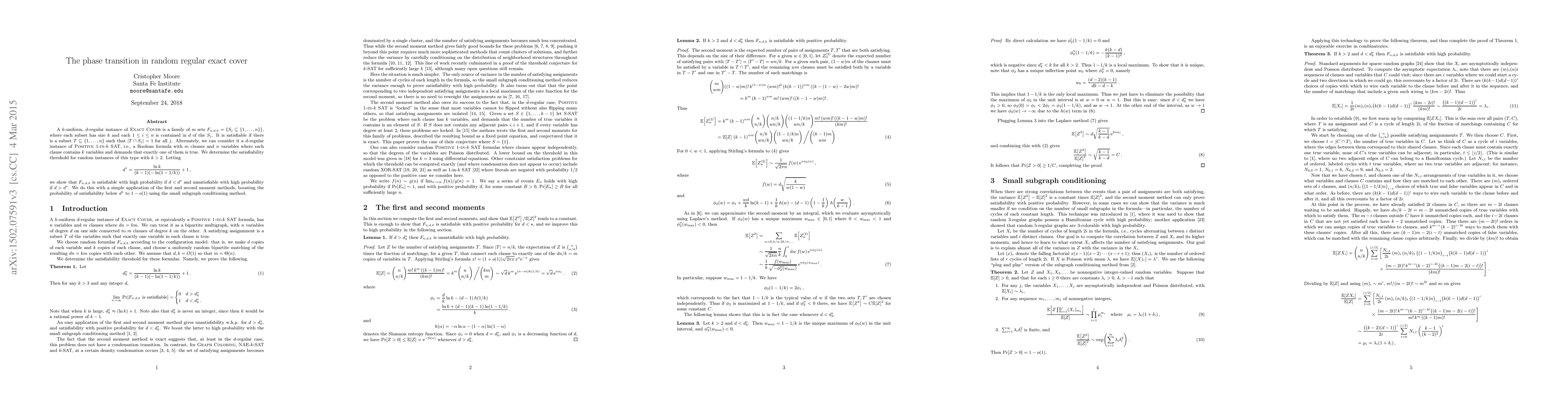 A $k$-uniform, $d$-regular instance of Exact Cover is a family of $m$ sets $F_{n,d,k} = \{ S_j \subseteq \{1,...,n\} \}$, where each subset has size $k$ and each $1 \le i \le n$ is contained in $d$ of the $S_j$. It is satisfiable if there is a subset $T \subseteq \{1,...,n\}$ such that $|T \cap S_j|=1$ for all $j$. Alternately, we can consider it a $d$-regular instance of Positive 1-in-$k$ SAT, i.e., a Boolean formula with $m$ clauses and $n$ variables where each clause contains $k$ variables and demands that exactly one of them is true. We determine the satisfiability threshold for random instances of this type with $k > 2$. Letting $d^\star = \frac{\ln k}{(k-1)(- \ln (1-1/k))} + 1$, we show that $F_{n,d,k}$ is satisfiable with high probability if $d < d^\star$ and unsatisfiable with high probability if $d > d^\star$. We do this with a simple application of the first and second moment methods, boosting the probability of satisfiability below $d^\star$ to $1-o(1)$ using the small subgraph conditioning method.
