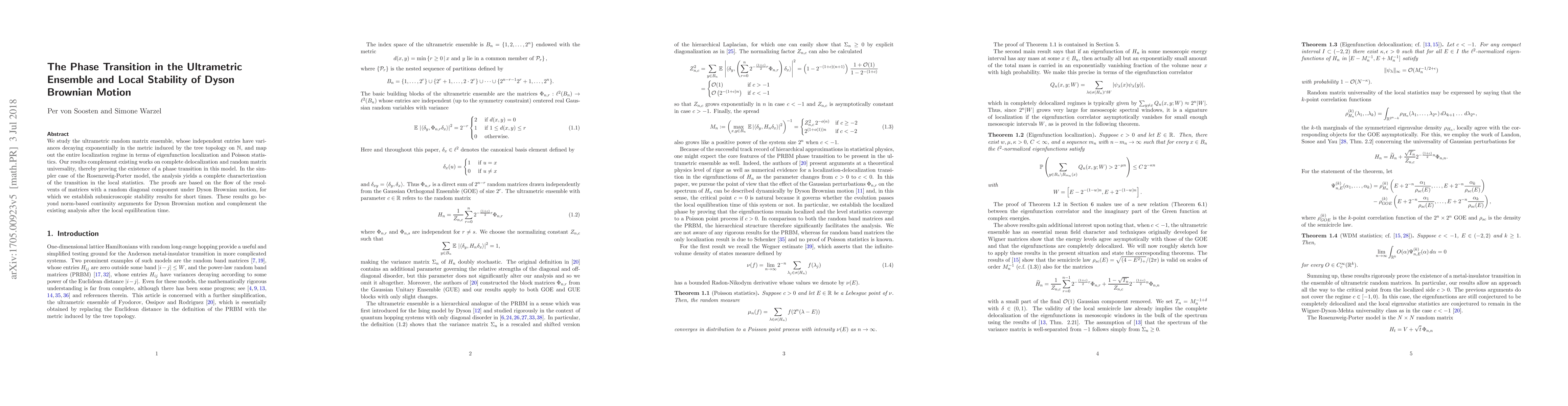 This paper investigates the ultrametric random matrix ensemble and identifies a phase transition in its localization regime, characterized by eigenfunction localization and Poisson statistics. It also provides a complete characterization of the transition in the Rosenzweig-Porter model, using submicroscopic stability results for the short-time behavior of Dyson Brownian motion.