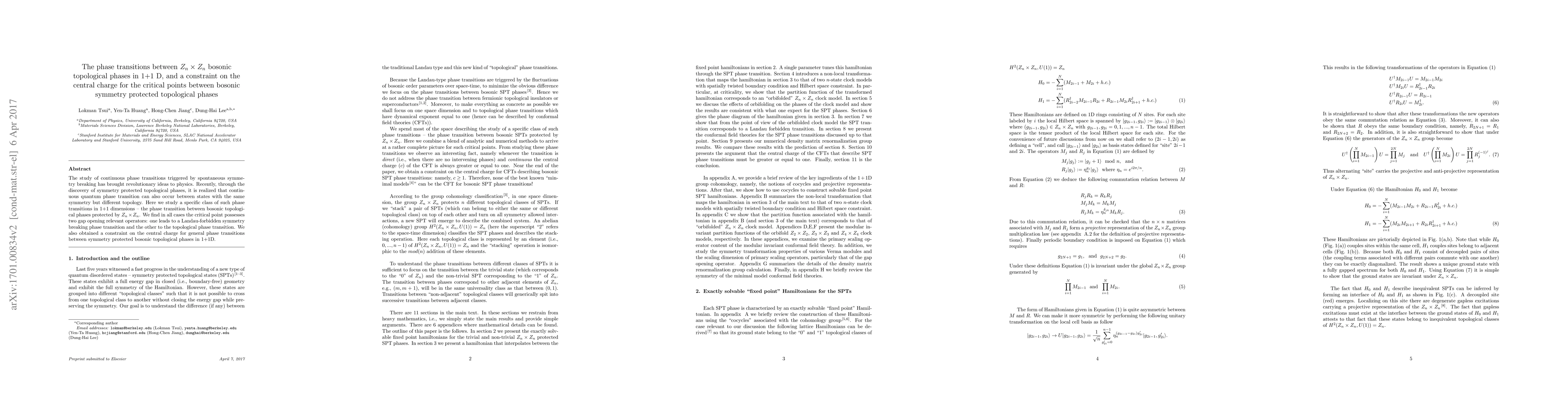This paper investigates phase transitions in 1+1D between bosonic topological phases protected by $Z_n\times Z_n$ symmetry, revealing critical points with two gap-opening operators. It also establishes a constraint on the central charge for transitions between such symmetry-protected topological phases.
