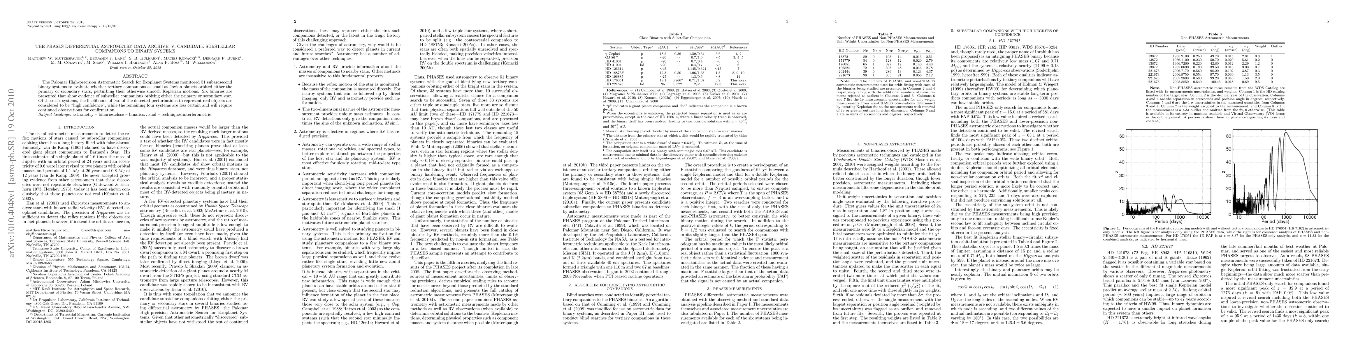 The PHASES Differential Astrometry Data Archive identified six binary systems with evidence of substellar companions, with high confidence in two cases, while the remaining four require further observations for confirmation. The study aims to detect Jovian-sized tertiary companions perturbing binary systems' motions.