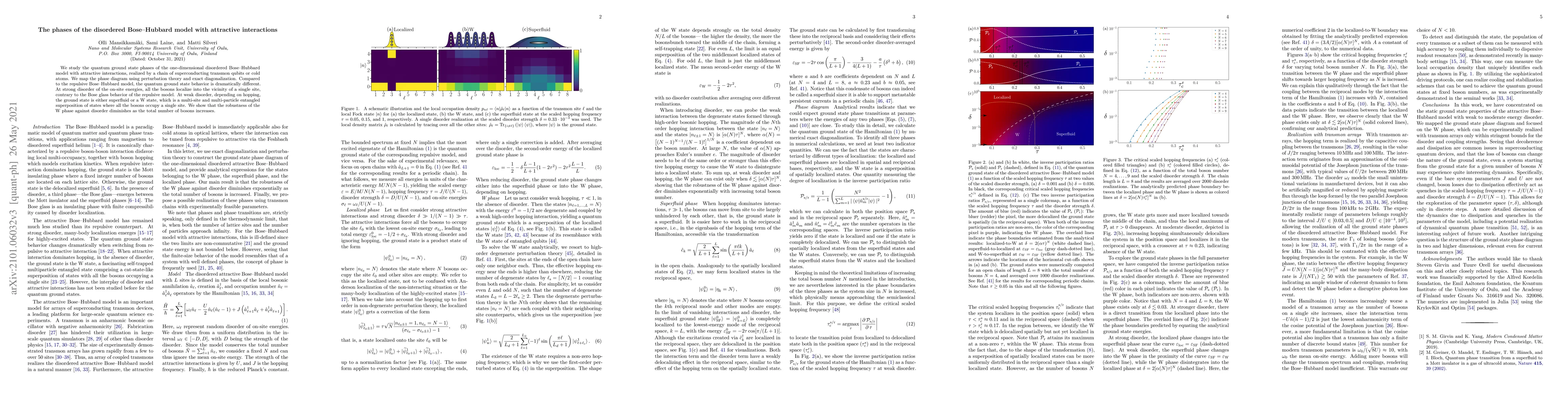 We study the quantum ground state phases of the one-dimensional disordered Bose--Hubbard model with attractive interactions, realized by a chain of superconducting transmon qubits or cold atoms. We map the phase diagram using perturbation theory and exact diagonalization. Compared to the repulsive Bose--Hubbard model, the quantum ground state behavior is dramatically different. At strong disorder of the on-site energies, all the bosons localize into the vicinity of a single site, contrary to the Bose glass behavior of the repulsive model. At weak disorder, depending on hopping, the ground state is either superfluid or a W state, which is a multi-site and multi-particle entangled superposition of states where all the bosons occupy a single site. We show that the robustness of the W phase against disorder diminishes as the total number of bosons increases.