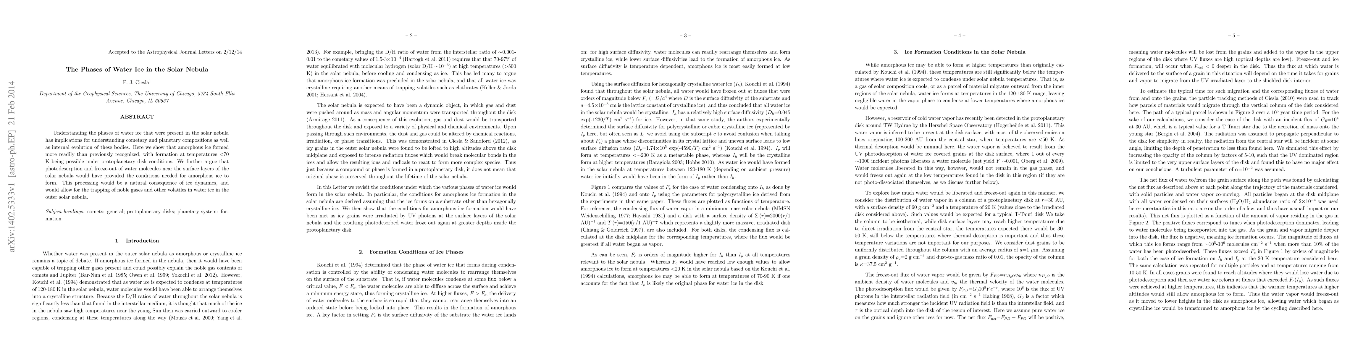 This paper explores the formation of amorphous water ice in the solar nebula, demonstrating its prevalence at temperatures below 70 K. It suggests that photodesorption and freeze-out processes facilitated the trapping of noble gases and volatiles, influencing cometary and planetary compositions and their evolution.