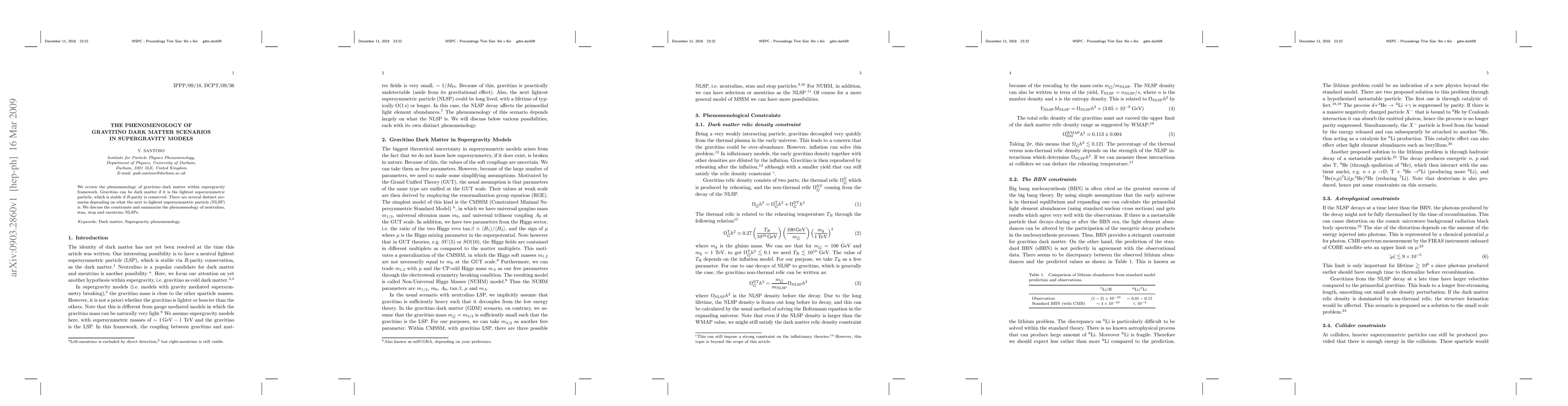 This paper reviews gravitino dark matter scenarios in supergravity models, focusing on the conditions under which gravitinos can be the lightest supersymmetric particle. It examines various scenarios based on different next-to-lightest supersymmetric particles, summarizing constraints and phenomenology for neutralino, stau, stop, and sneutrino NLSPs.