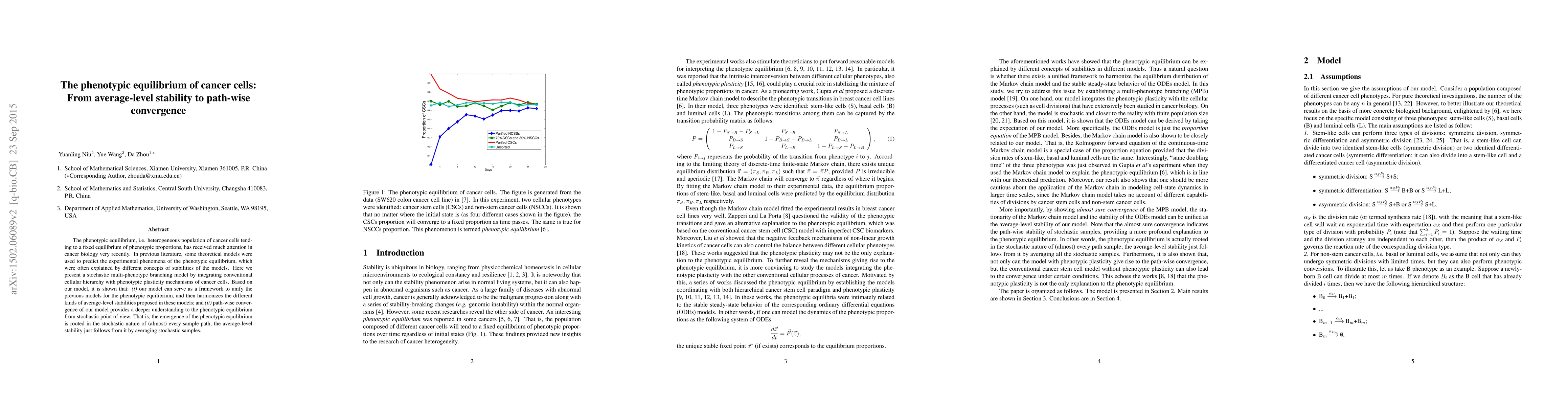 The phenotypic equilibrium, i.e. heterogeneous population of cancer cells tending to a fixed equilibrium of phenotypic proportions, has received much attention in cancer biology very recently. In previous literature, some theoretical models were used to predict the experimental phenomena of the phenotypic equilibrium, which were often explained by different concepts of stabilities of the models. Here we present a stochastic multi-phenotype branching model by integrating conventional cellular hierarchy with phenotypic plasticity mechanisms of cancer cells. Based on our model, it is shown that: (i) our model can serve as a framework to unify the previous models for the phenotypic equilibrium, and then harmonizes the different kinds of average-level stabilities proposed in these models; and (ii) path-wise convergence of our model provides a deeper understanding to the phenotypic equilibrium from stochastic point of view. That is, the emergence of the phenotypic equilibrium is rooted in the stochastic nature of (almost) every sample path, the average-level stability just follows from it by averaging stochastic samples.
