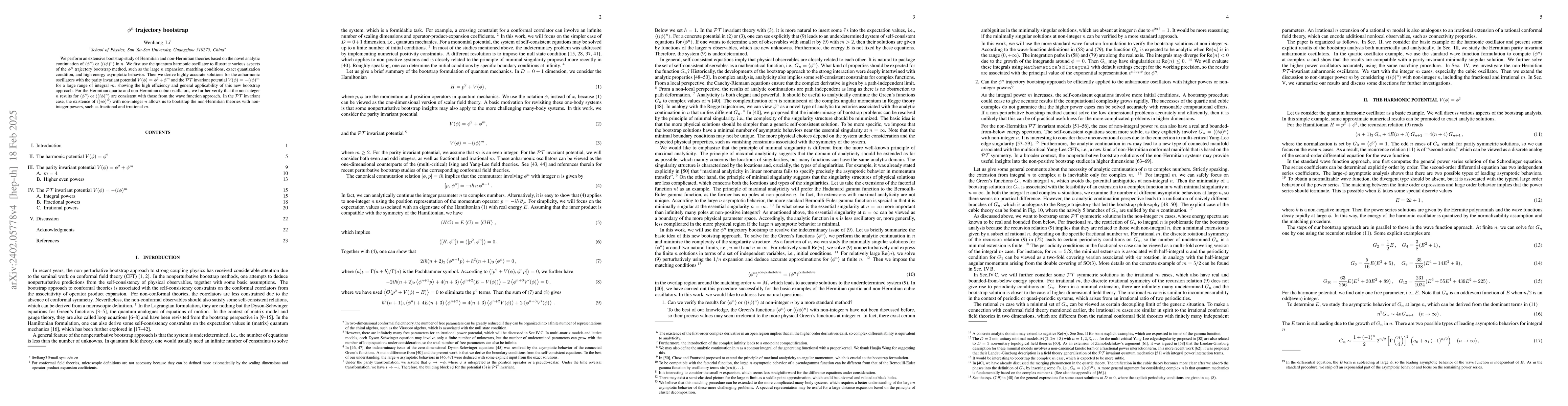 The Green's functions $G_n=\langle\phi^n\rangle$ and their self-consistent equations admit analytic continuations to complex $n$. The indeterminacy of bootstrap problems can be resolved by the principle of minimal singularity. We use the harmonic oscillator to illustrate various aspects of the bootstrap analysis, such as the large $n$ expansion, matching conditions, exact quantization condition, and high energy asymptotic behavior. For the Hermitian quartic and non-Hermitian cubic oscillators, we revisit the $\phi^n$ trajectories at non-integer $n$ by the standard wave function formulation. The results are in agreement with the minimally singular solutions. Using the matching procedure, we obtain accurate solutions for anharmonic oscillators with higher powers. In particular, the existence of $G_n$ with non-integer $n$ allows us to bootstrap the $\mathcal{PT}$ invariant oscillators with non-integer powers.