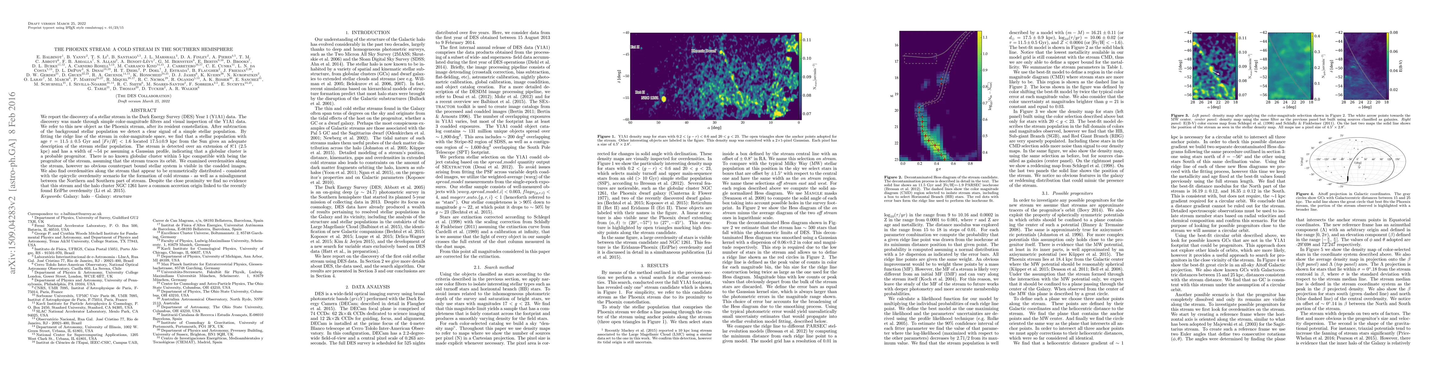 The Phoenix stream, discovered in Dark Energy Survey data, is a cold stellar stream in the Southern hemisphere, likely originating from a globular cluster. The stream's stellar population is estimated to be 11.5 Gyr old and metal-poor, located 17.5 kpc from the Sun.