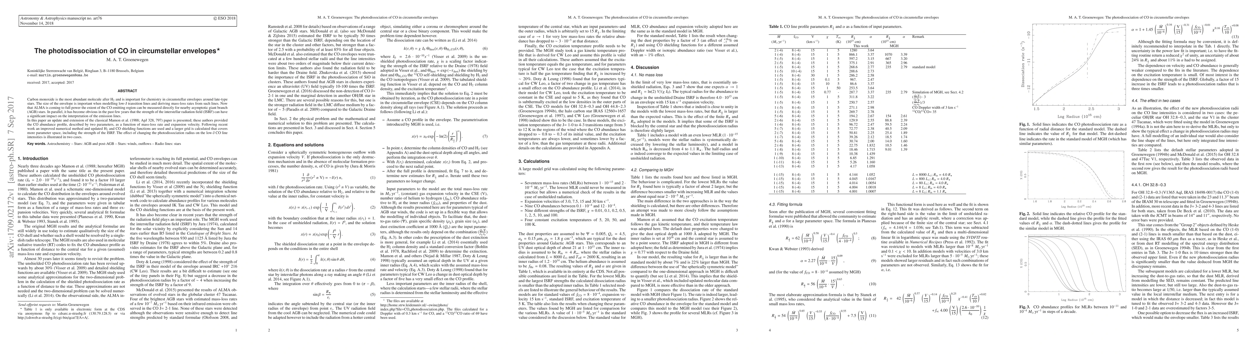 Carbon monoxide is the most abundant molecule after H$_2$ and is important for chemistry in circumstellar envelopes around late-type stars. The size of the envelope is important when modelling low-J transition lines and deriving mass-loss rates from such lines. Now that ALMA is coming to full power the extent of the CO emitting region can be measured directly for nearby asymptotic giant branch (AGB) stars. In parallel, it has become obvious in the past few years that the strength of the interstellar radiation field (ISRF) can have a significant impact on the interpretation of the emission lines. In this paper an update and extension of the classical Mamon et al. (1988; ApJ 328, 797) paper is presented; these authors provided the CO abundance profile, described by two parameters, as a function of mass-loss rate and expansion velocity. Following recent work an improved numerical method and updated H$_2$ and CO shielding functions are used and a larger grid is calculated that covers more parameter space, including the strength of the ISRF. The effect of changing the photodissociation radius on the low-J CO line intensities is illustrated in two cases.