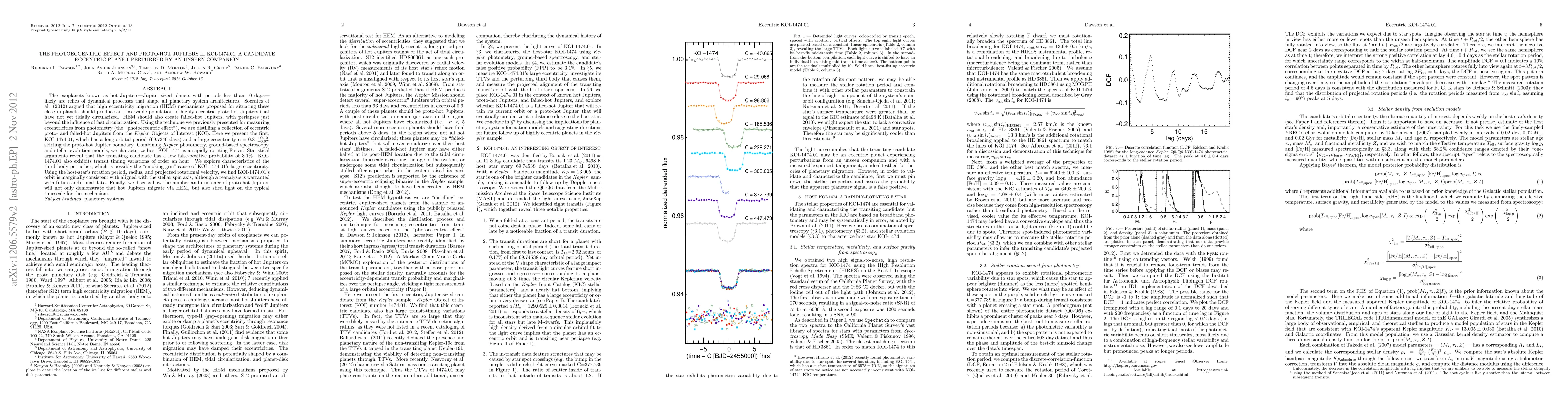 The exoplanets known as hot Jupiters---Jupiter-sized planets with periods less than 10 days---likely are relics of dynamical processes that shape all planetary system architectures. Socrates et al. (2012) argued that high eccentricity migration (HEM) mechanisms proposed for situating these close-in planets should produce an observable population of highly eccentric proto-hot Jupiters that have not yet tidally circularized. HEM should also create failed-hot Jupiters, with periapses just beyond the influence of fast circularization. Using the technique we previously presented for measuring eccentricities from photometry (the "photoeccentric effect"), we are distilling a collection of eccentric proto- and failed-hot Jupiters from the Kepler Objects of Interest (KOI). Here we present the first, KOI-1474.01, which has a long orbital period (69.7340 days) and a large eccentricity e = 0.81+0.10/-0.07, skirting the proto-hot Jupiter boundary. Combining Kepler photometry, ground-based spectroscopy, and stellar evolution models, we characterize host KOI-1474 as a rapidly-rotating F-star. Statistical arguments reveal that the transiting candidate has a low false-positive probability of 3.1%. KOI-1474.01 also exhibits transit timing variations of order an hour. We explore characteristics of the third-body perturber, which is possibly the "smoking-gun" cause of KOI-1474.01's large eccentricity. Using the host-star's rotation period, radius, and projected rotational velocity, we find KOI-1474.01's orbit is marginally consistent with aligned with the stellar spin axis, although a reanalysis is warranted with future additional data. Finally, we discuss how the number and existence of proto-hot Jupiters will not only demonstrate that hot Jupiters migrate via HEM, but also shed light on the typical timescale for the mechanism.