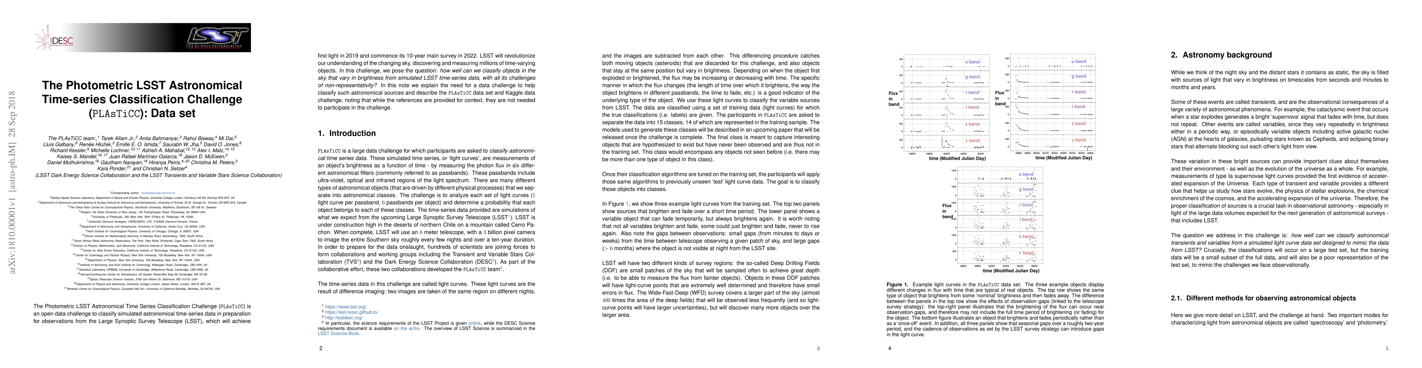 The Photometric LSST Astronomical Time-series Classification Challenge (PLAsTiCC) provides a dataset for classifying simulated astronomical time-series data from the Large Synoptic Survey Telescope (LSST). The challenge aims to prepare for LSST's 10-year main survey by assessing the ability to classify objects that vary in brightness.
