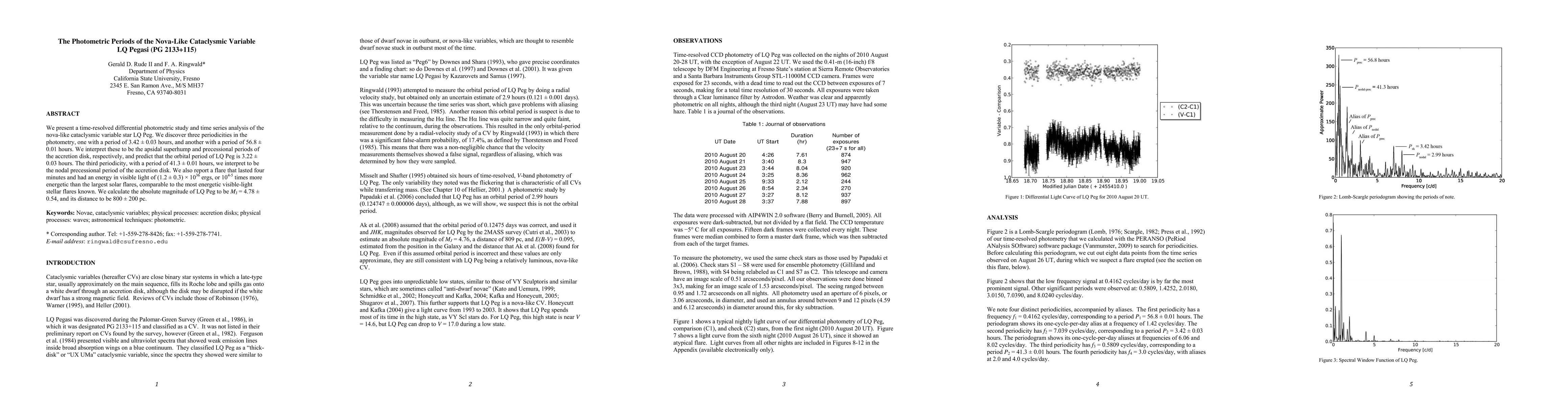 We present a time-resolved differential photometric study and time series analysis of the nova-like cataclysmic variable star LQ Peg. We discover three periodicities in the photometry, one with a period of 3.42 +/- 0.03 hours, and another with a period of 56.8 +/- 0.01 hours. We interpret these to be the apsidal superhump and precessional periods of the accretion disk, respectively, and predict that the orbital period of LQ Peg is 3.22 +/- 0.03 hours. The third periodicity, with a period of 41.3 +/- 0.01 hours, we interpret to be the nodal precessional period of the accretion disk. We also report a flare that lasted four minutes and had an energy in visible light of (1.2 +/- 0.3) x 10^36 ergs, or 10^4-5 times more energetic than the largest solar flares, comparable to the most energetic visible-light stellar flares known. We calculate the absolute magnitude of LQ Peg to be M_J = 4.78 +/- 0.54, and its distance to be 800 +/- 200 pc.