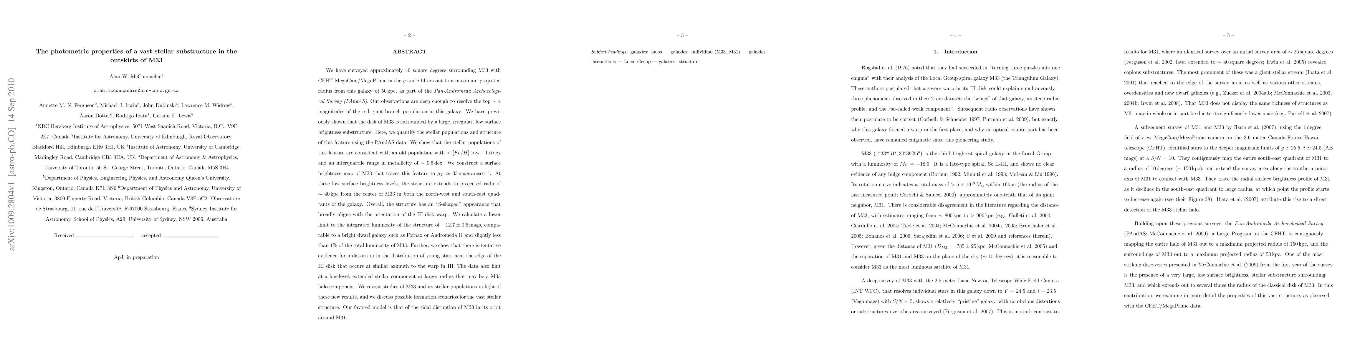 We have surveyed $\sim40$sq.degrees surrounding M33 with CFHT MegaCam in the g and i filters, as part of the Pan-Andromeda Archaeological Survey. Our observations are deep enough to resolve the top 4mags of the red giant branch population in this galaxy. We have previously shown that the disk of M33 is surrounded by a large, irregular, low-surface brightness substructure. Here, we quantify the stellar populations and structure of this feature using the PAndAS data. We show that the stellar populations of this feature are consistent with an old population with $<[Fe/H]>\sim-1.6$dex and an interquartile range in metallicity of $\sim0.5$dex. We construct a surface brightness map of M33 that traces this feature to $\mu_V\simeq33$mags\,arcsec$^{-2}$. At these low surface brightness levels, the structure extends to projected radii of $\sim40$kpc from the center of M33 in both the north-west and south-east quadrants of the galaxy. Overall, the structure has an "S-shaped" appearance that broadly aligns with the orientation of the HI disk warp. We calculate a lower limit to the integrated luminosity of the structure of $-12.7\pm0.5$mags, comparable to a bright dwarf galaxy such as Fornax or AndII and slightly less than $1\$ of the total luminosity of M33. Further, we show that there is tentative evidence for a distortion in the distribution of young stars near the edge of the HI disk that occurs at similar azimuth to the warp in HI. The data also hint at a low-level, extended stellar component at larger radius that may be a M33 halo component. We revisit studies of M33 and its stellar populations in light of these new results, and we discuss possible formation scenarios for the vast stellar structure. Our favored model is that of the tidal disruption of M33 in its orbit around M31.