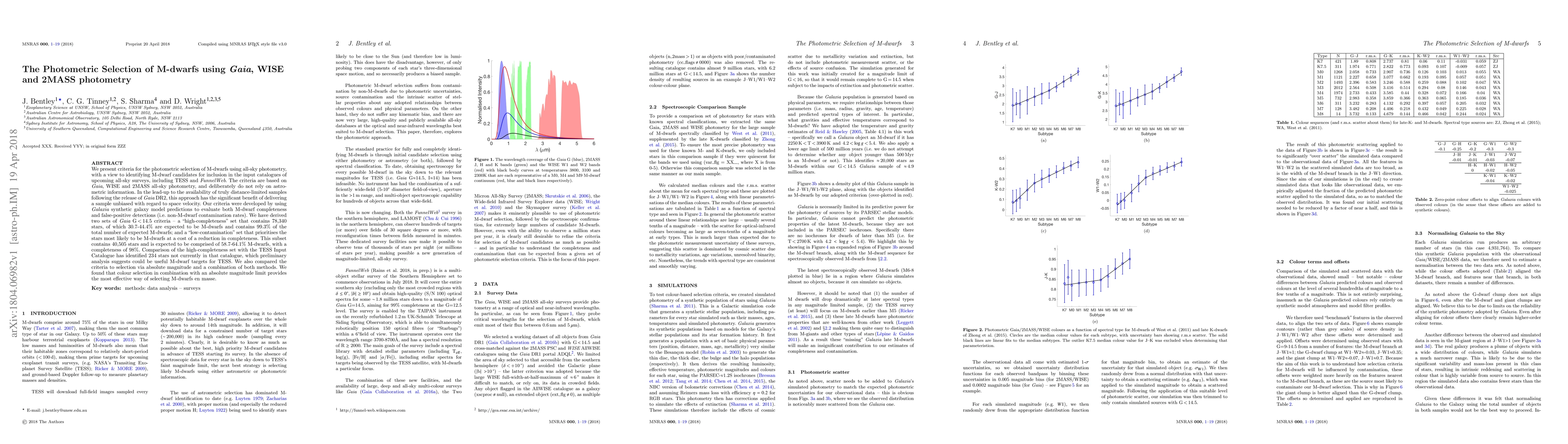 The research presents criteria for photometric selection of M-dwarfs using Gaia, WISE, and 2MASS photometry, developed by evaluating M-dwarf completeness and false-positive rates with Galaxia synthetic galaxy model predictions. Two sets of Gaia G > 14.5 criteria, 'high-completeness' and 'low-contamination', were derived to identify M-dwarf candidates for upcoming surveys like TESS and FunnelWeb.