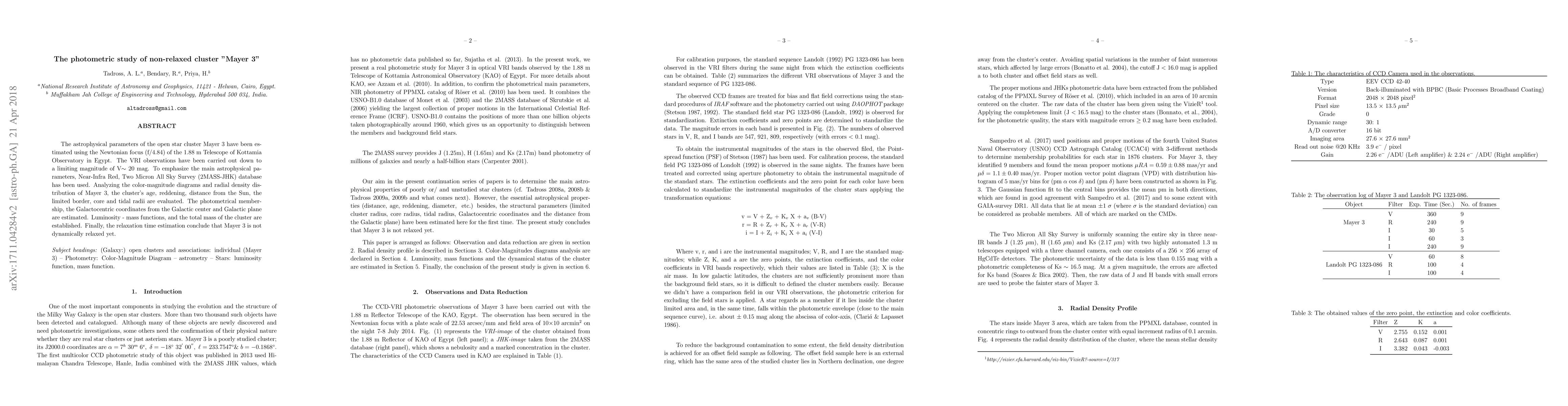 The astrophysical parameters of the open star cluster Mayer 3 have been estimated using the Newtonian focus (f/4.84) of the 1.88 m Telescope of Kottamia Observatory in Egypt. The VRI observations have been carried out down to a limiting magnitude of V ~ 20 mag. To emphasize the main astrophysical parameters, Near-Infra Red, Two Micron All Sky Survey (2MASS-JHK) database has been used. Analyzing the color-magnitude diagrams and radial density distribution of Mayer 3, the cluster's age, reddening, distance from the Sun, the limited border, core and tidal radii are evaluated. The photometrical membership, the Galactocentric coordinates from the Galactic center and Galactic plane are estimated. Luminosity - mass functions, and the total mass of the cluster are established. Finally, the relaxation time estimation conclude that Mayer 3 is not dynamically relaxed yet.