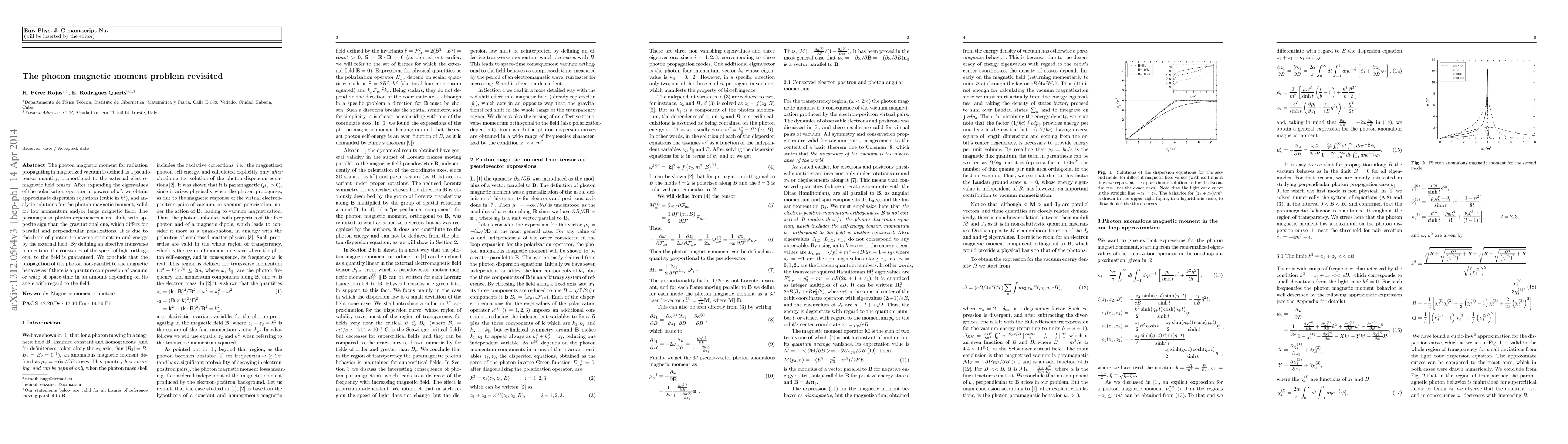 The photon magnetic moment for radiation propagating in magnetized vacuum is defined as a pseudo-tensor quantity, proportional to the external electromagnetic field tensor. After expanding the eigenvalues of the polarization operator in powers of $k^2$, we obtain approximate dispersion equations (cubic in $k^2$), and analytic solutions for the photon magnetic moment, valid for low momentum and/or large magnetic field. The paramagnetic photon experiences a red shift, with opposite sign than the gravitational one, which differs for parallel and perpendicular polarizations. It is due to the drain of photon transverse momentum and energy by the external field. By defining an effective transverse momentum, the constancy of the speed of light orthogonal to the field is guaranteed. We conclude that the propagation of the photon non-parallel to the magnetic behaves as if there is a quantum compression of vacuum or warp of space-time in an amount depending on its angle with regard to the field.
