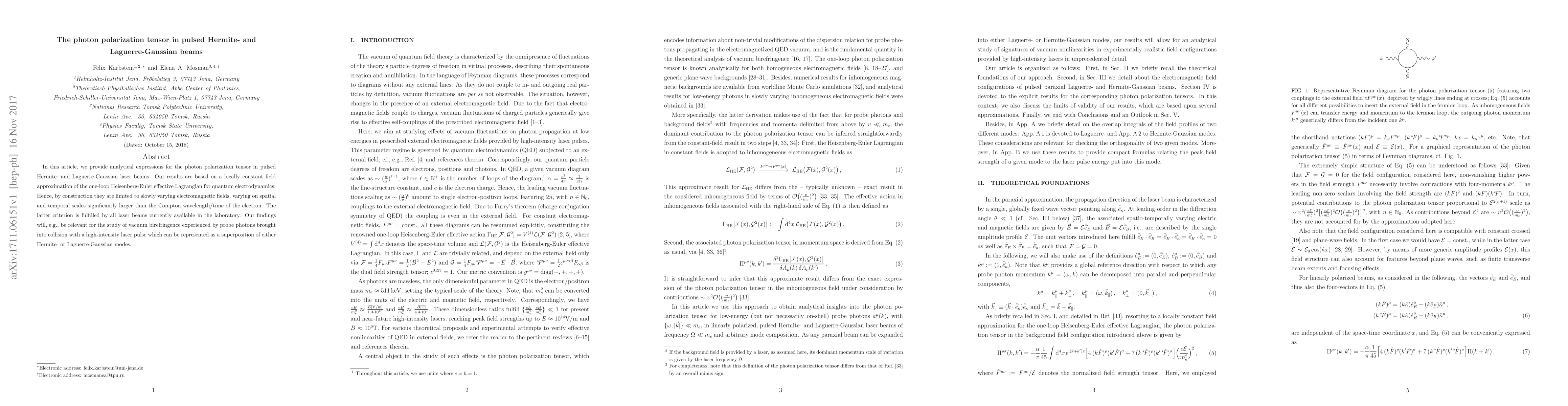 This paper derives analytical expressions for the photon polarization tensor in pulsed Hermite- and Laguerre-Gaussian laser beams using a locally constant field approximation of the one-loop Heisenberg-Euler effective Lagrangian. The results apply to slowly varying electromagnetic fields and are relevant for studying vacuum birefringence in high-intensity laser interactions.