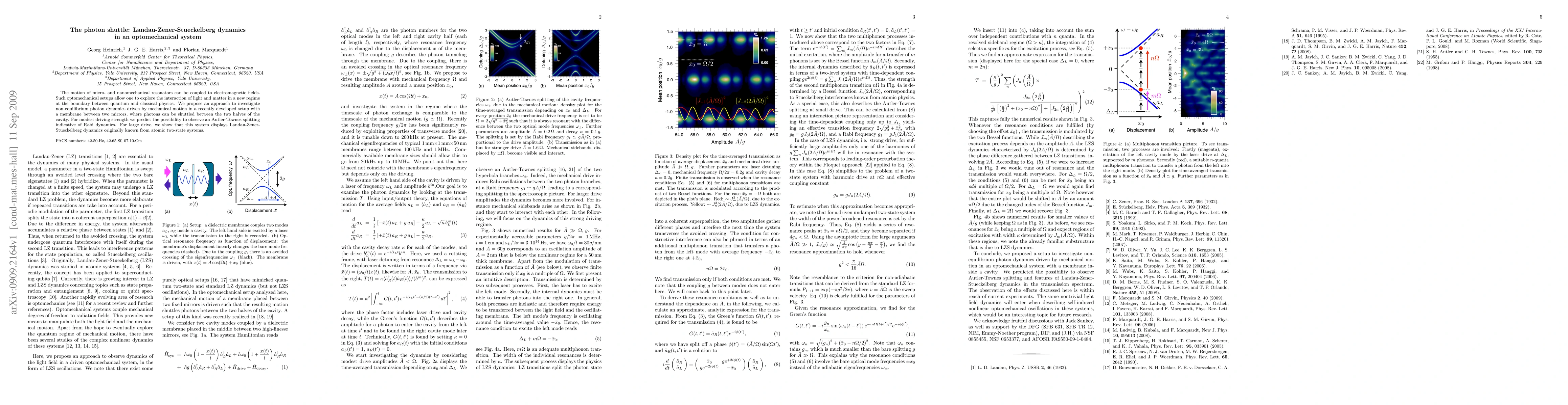 This paper investigates the dynamics of photons in an optomechanical system where mechanical resonators are coupled to electromagnetic fields. The authors propose observing Landau-Zener-Stueckelberg dynamics, originally from atomic systems, in a membrane-based optical cavity, predicting Autler-Townes splitting for modest driving and complex dynamics for large drive.