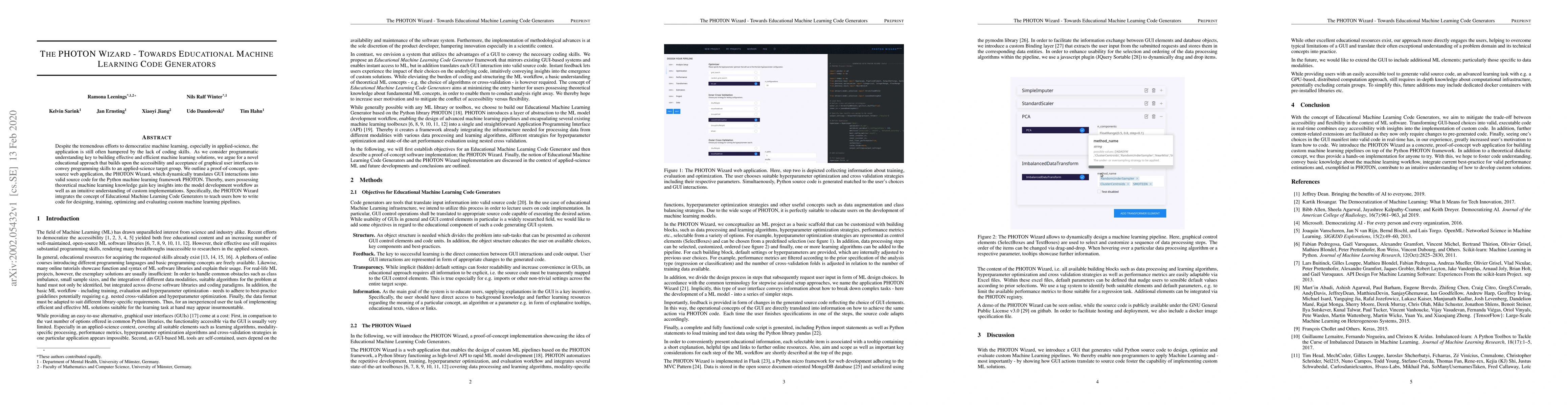 The PHOTON Wizard is an open-source web application that translates graphical user interface interactions into Python code for the PHOTON machine learning framework, aiming to democratize machine learning education by reducing the need for coding skills. It teaches users to design, train, optimize, and evaluate custom machine learning pipelines through interactive GUI-based learning.