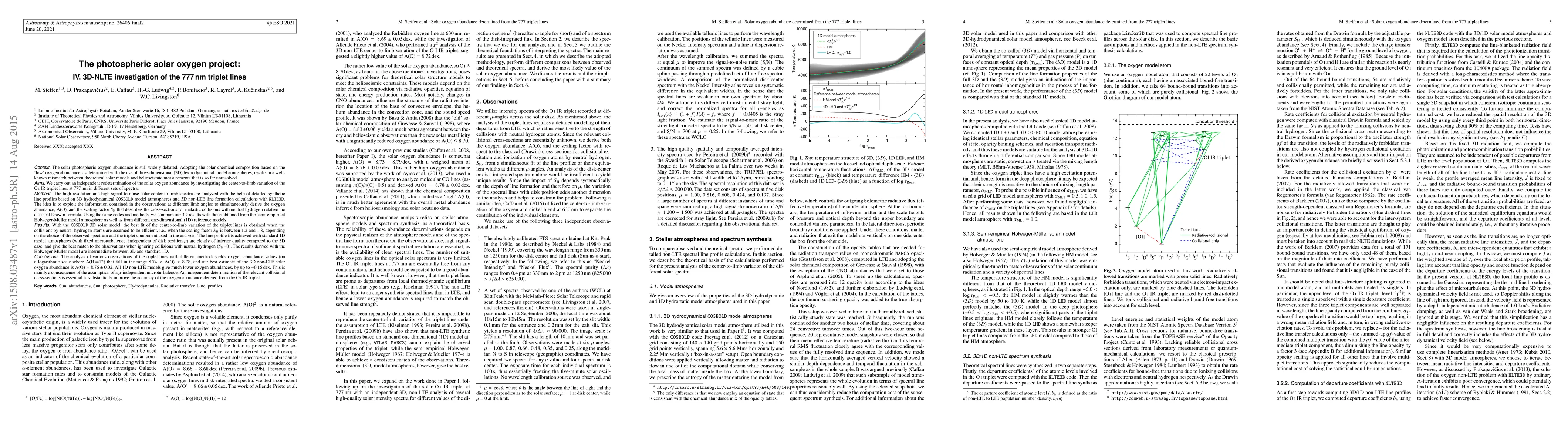 The paper presents a 3D-NLTE investigation of the 777 nm oxygen triplet lines to redetermine the solar oxygen abundance. Utilizing 3D hydrodynamical CO5BOLD model atmospheres and NLTETD for non-LTE line formation calculations, the study finds a best-fit solar oxygen abundance of A(O) = 8.76 ± 0.02, with a scaling factor SH between 1.2 and 1.8. This result significantly differs from 1D non-LTE models, which yield much lower oxygen abundances due to the assumption of a μ-independent microturbulence.