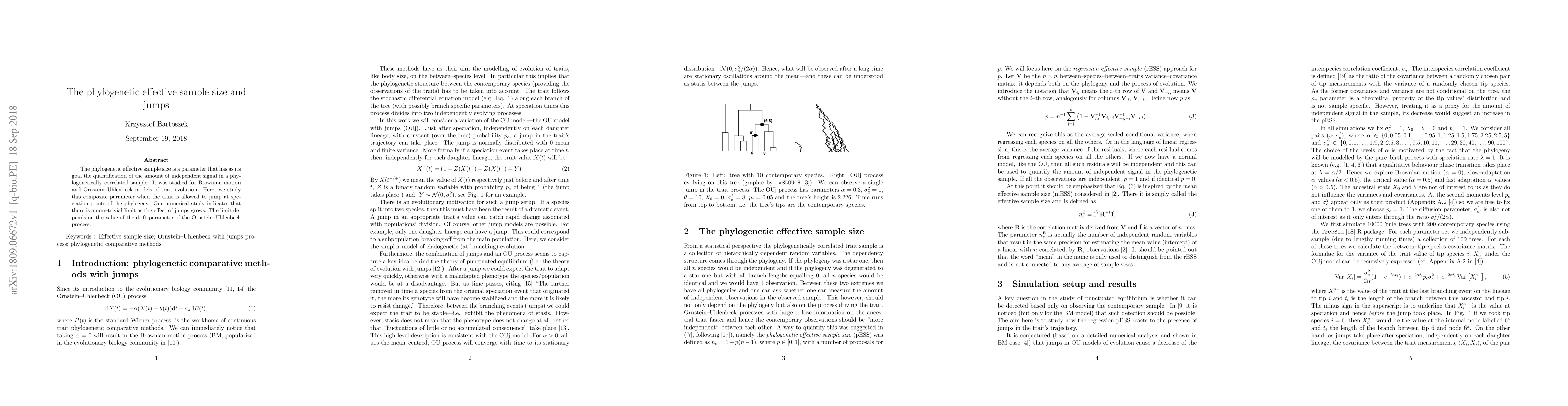 This paper investigates the phylogenetic effective sample size under trait evolution models, focusing on scenarios where traits can jump at speciation points. The study finds a non-trivial limit for this parameter as the effect of jumps increases, which depends on the drift parameter of the Ornstein-Uhlenbeck process.