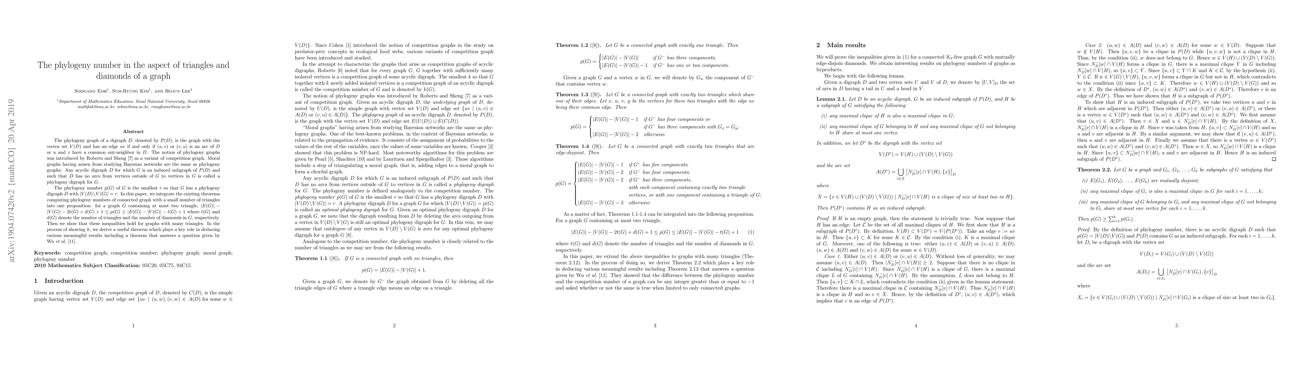 This paper explores the phylogeny number of graphs, specifically focusing on acyclic digraphs and their competition and underlying graphs. It establishes inequalities for the phylogeny number in graphs with a small number of triangles and diamonds, extending the results to graphs with many triangles and deriving a key theorem that addresses a question posed by Wu et al.