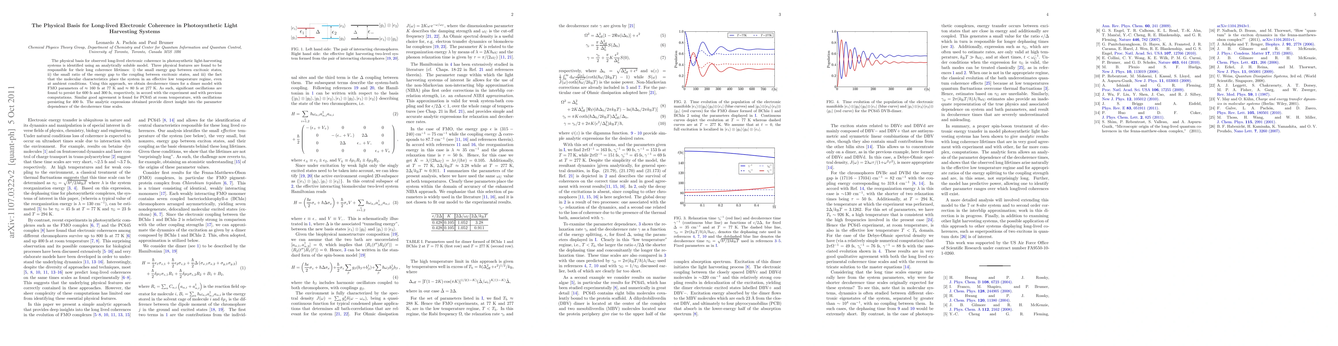 The research uses an analytically soluble model to identify the physical basis for long-lived electronic coherence in photosynthetic light-harvesting systems, focusing on three key features: small energy gap between excitonic states, small ratio of the energy gap to the coupling between excitonic states, and effective low-temperature regime at ambient conditions.
